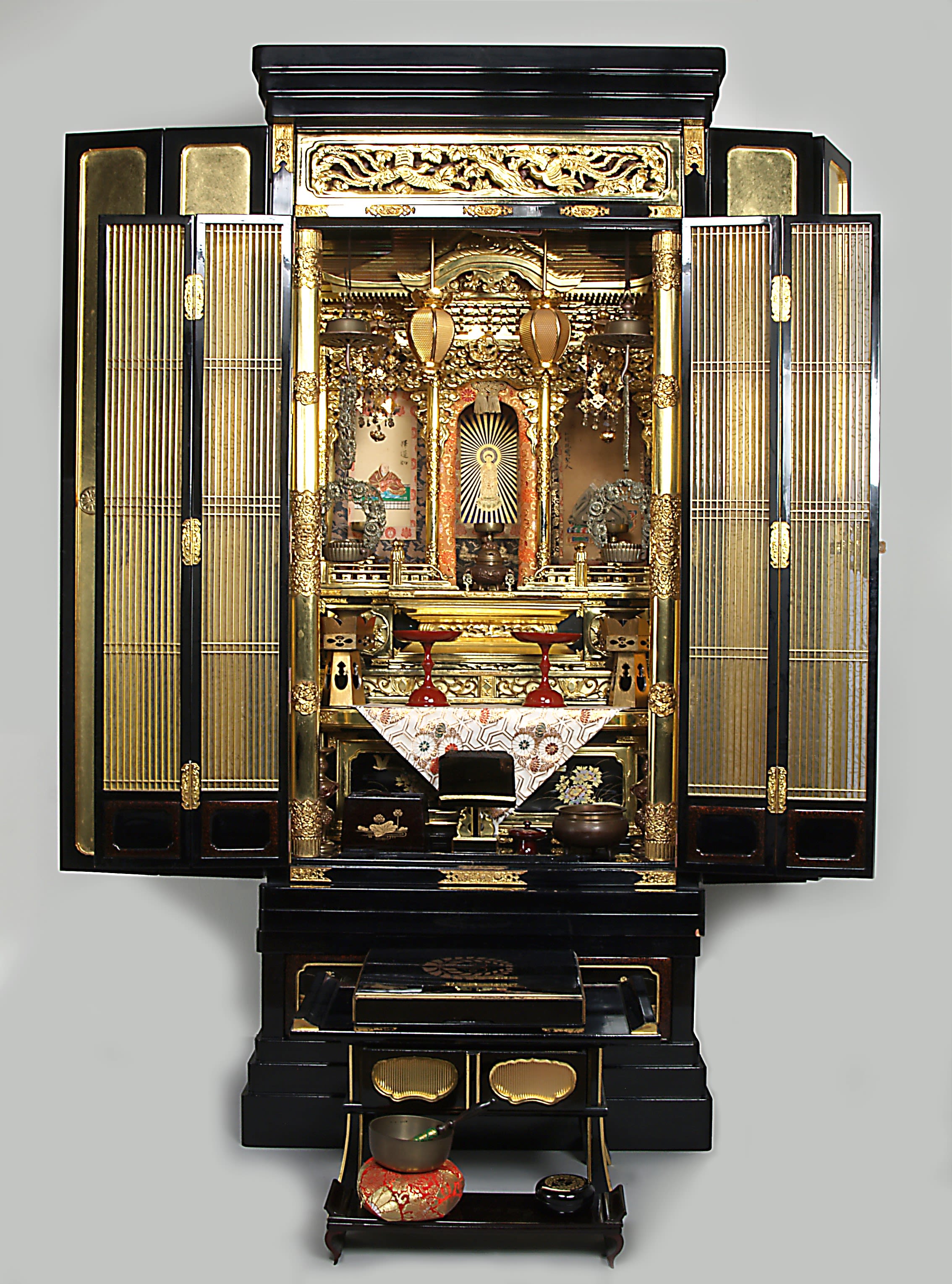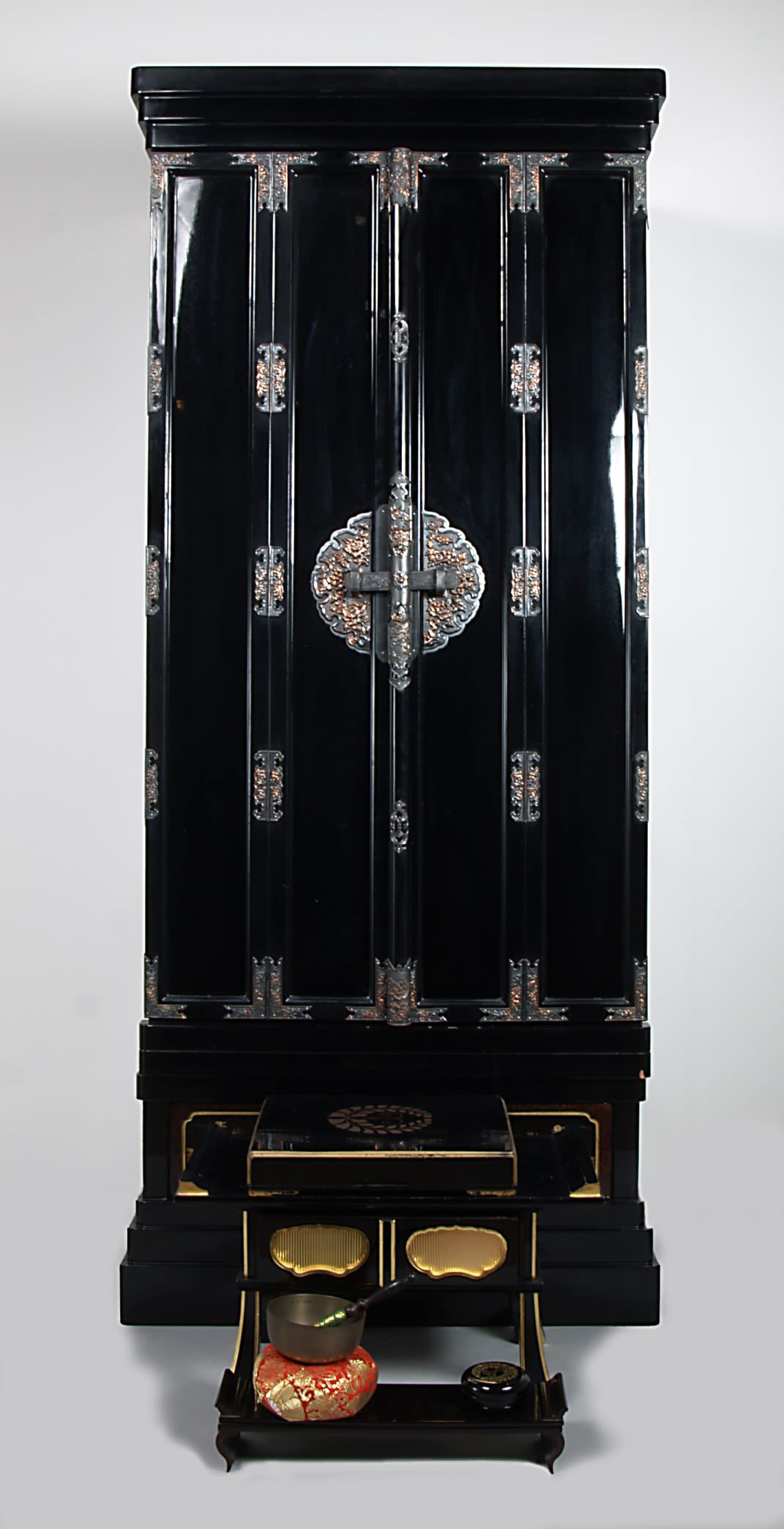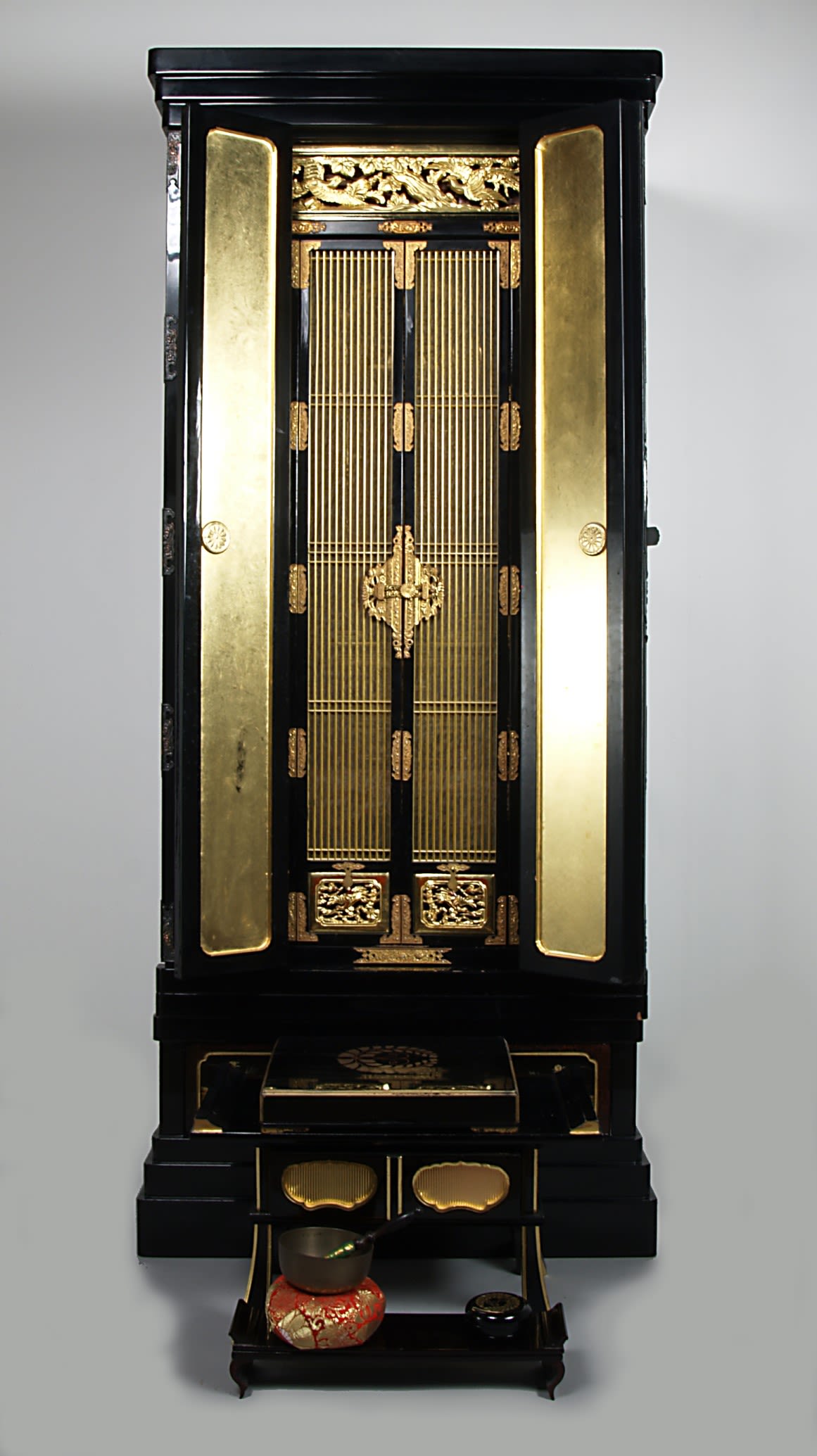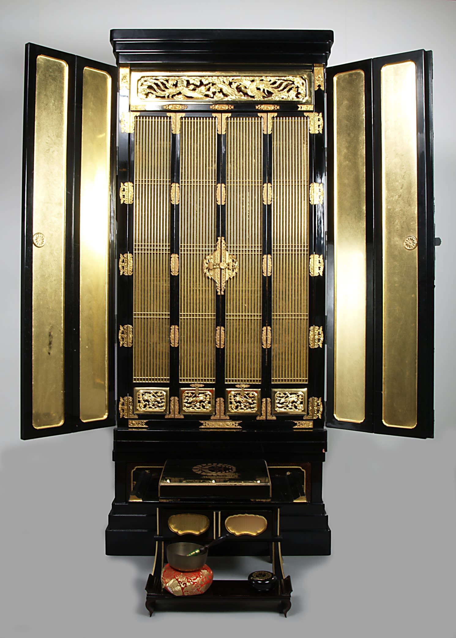 Buddhist family altars like this one are known as a Butsudan. They can be used to hold memorial tablets for dead ancestors and representations of Buddhist deities.