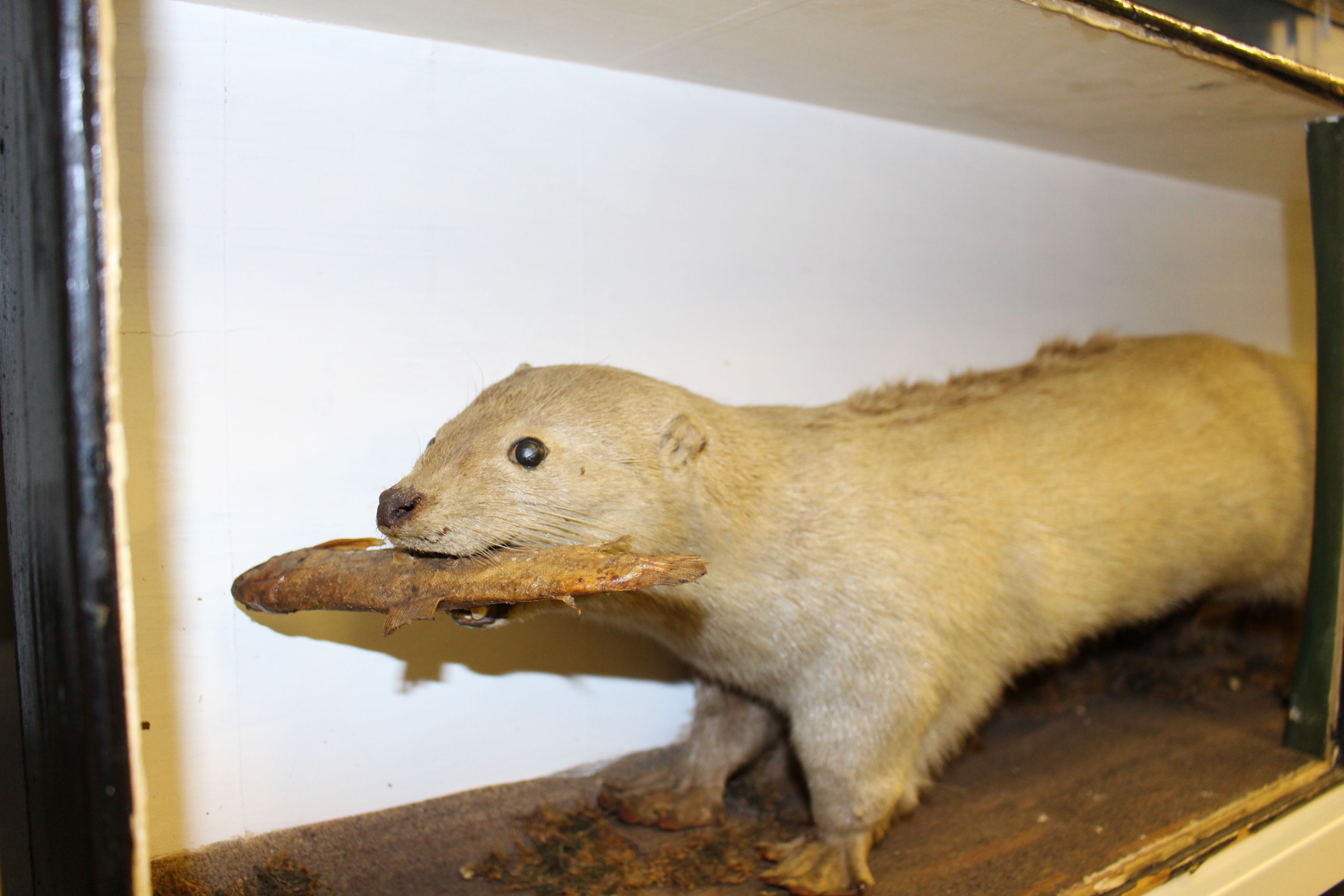 Image: Otter on all fours with fish in mouth, in a box with a basic habitat-like base and white painted background.