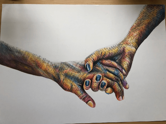 “My piece depicts the interwovenness of the Durham community. The emotive hands, drawn in greyscale, are not indicative of age, gender, sexual orientation or background. The backdrop of Durham’s intricate cityscape sinews behind the hands like veins, symbolising the way Durham is within us, and is precisely what unites us all, irrespective of race, class or creed. The power of such connections is profound, and can have real and influential long-lasting impacts.”