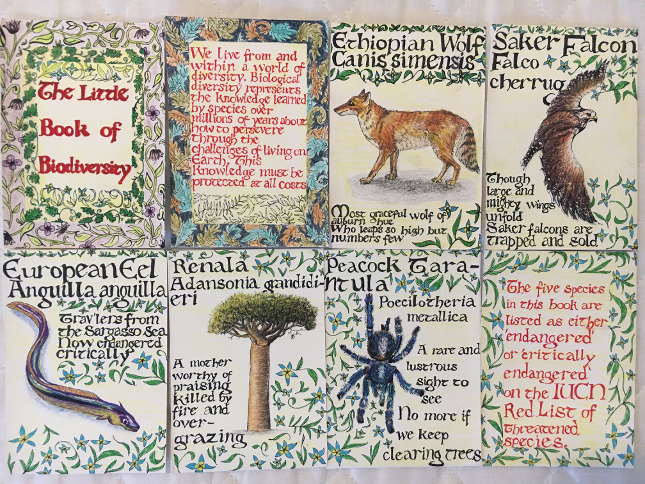 It commemorates species across a wide geographical and biological scope. I didn’t want to reiterate the popular ‘poster’ animals of climate activism, such as polar bears and sea turtles; I hope to show love for these species, including those that typically induce antipathy (eels and spiders). The recurring forget-me-not is a symbol of remembrance for diverse life-forms, and hope for their continued survival.