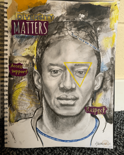 The quotes on the hands depict that the acceptance of diversity in society has not been straightforward; it is the product of much bravery. The quotes are a commendation, and highlight that their calls for inclusivity over oppression shall be remembered, and society (like the coloured pencil over the quotes) has been “built” from this.”