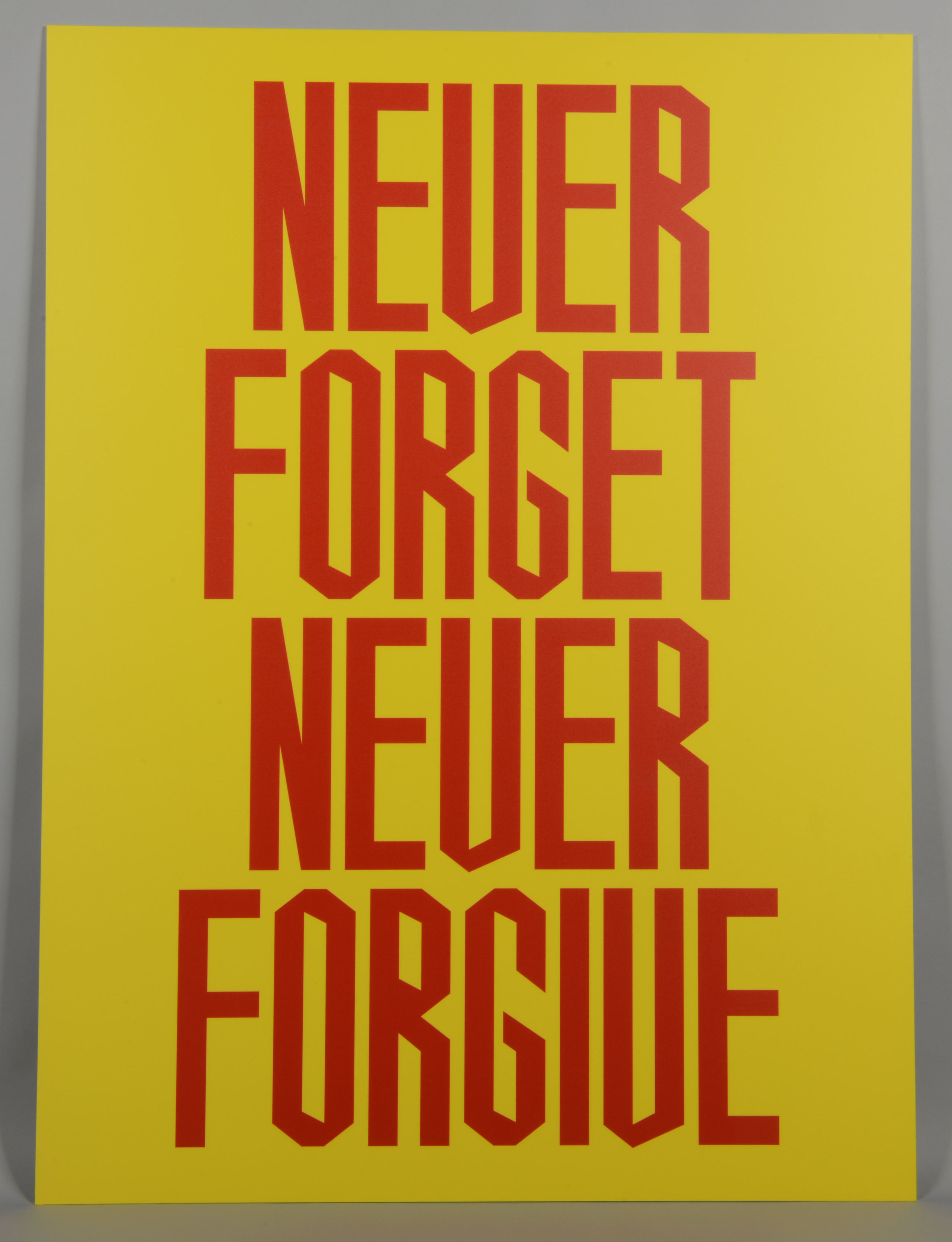 Craig Oldham, In Loving Memory of Work, Never Forgive Never Forget, 2015. Plastic composite print. Durham University Collection.