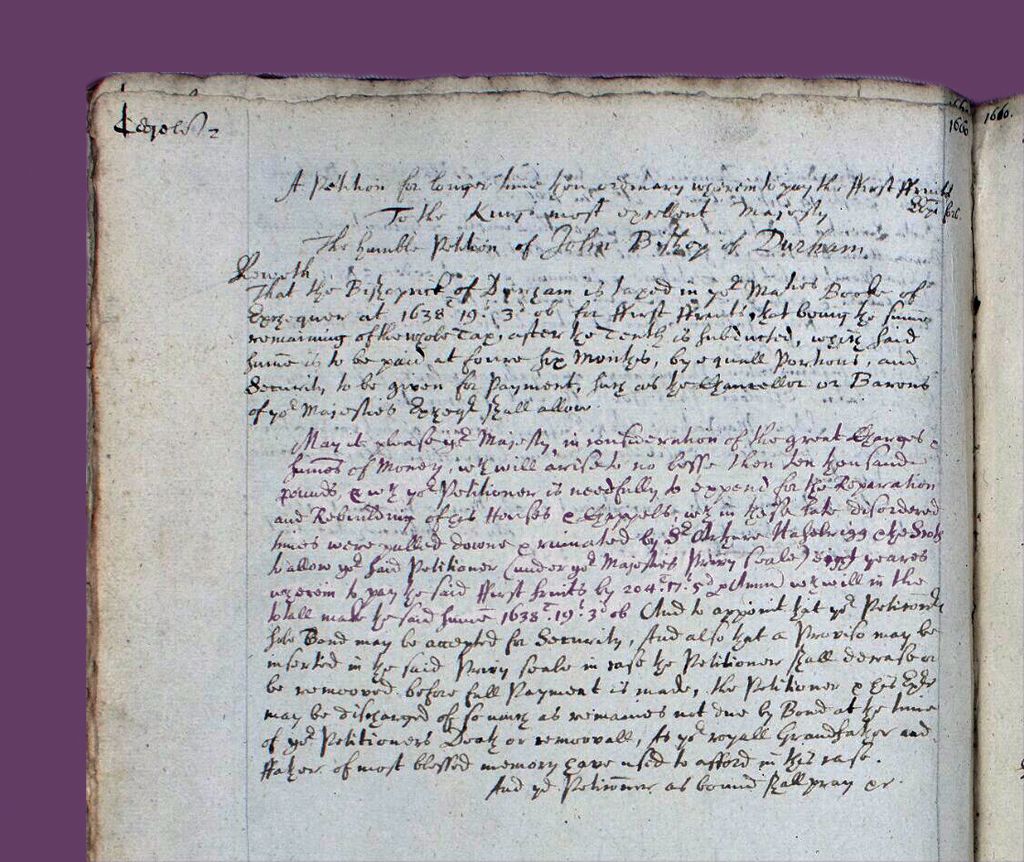 Copy of a petition by John Cosin, bishop of Durham, to the king, for 8 years to pay his first fruits as he has much rebuilding to do of houses and chapels after the ruinations of Sir Arthur Hasilrig and the Scots in the “late discordant times”, [1660]. DUL MSP 25, f. 37v