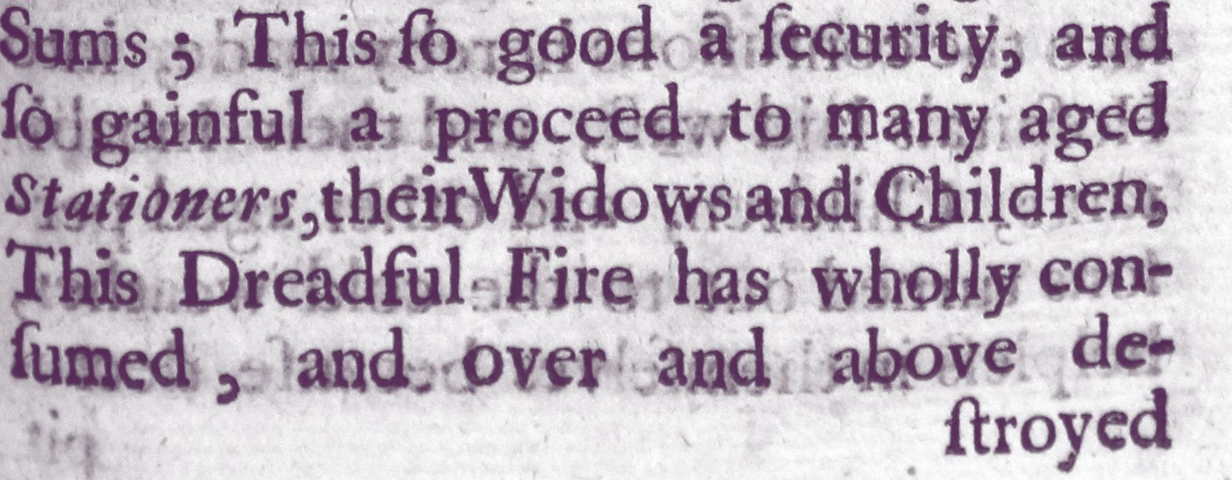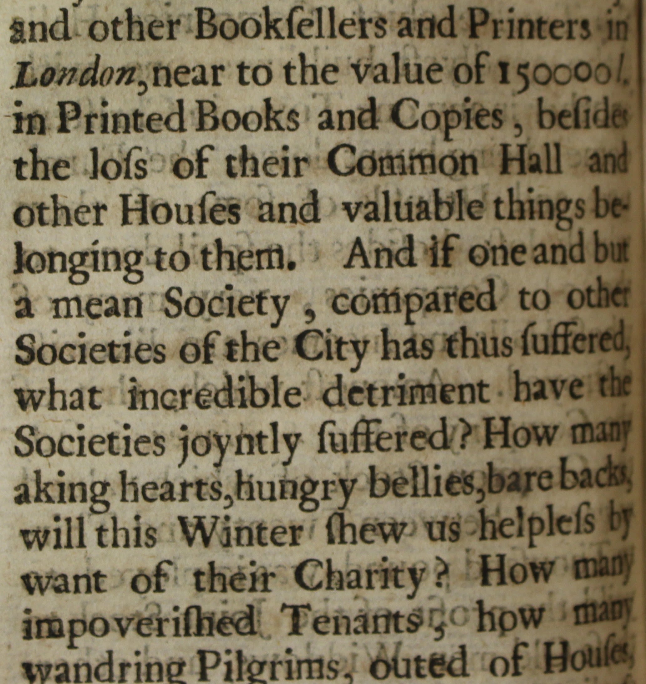London was a major fire hazard with its densely packed wooden houses and in September 1666, the city was completely gutted by a fire that lasted five days. The Stationers’ Company (the guild for printers and booksellers) was hit particularly hard. Its stock of printed publications went up in flames, leaving many families involved in the book trade destitute.