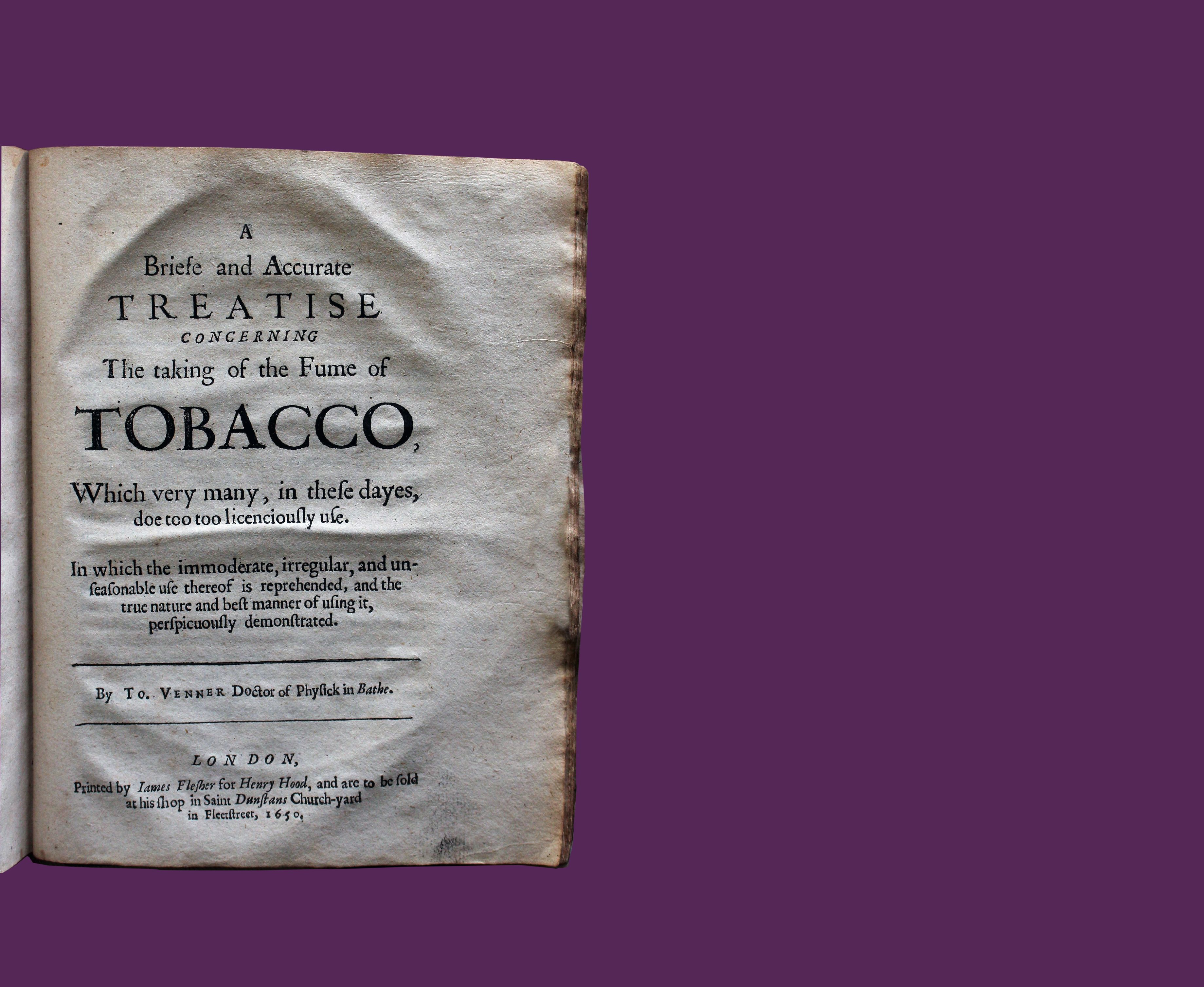 Tobias Venner, Via recta ad vitam longam … Whereunto is annexed by the same author, a very necessary, and compendius treatise of the famous baths of Bathe. With a censure of the medicinall faculties of the water of St. Vincents-Rocks neer the city of Bristoll. As also an accurate treatise concerning tobacco. All which are likewise amplified since the former impressions. London: printed by James Flesher, for Henry Hood, 1650. DUL Routh 69.G.26