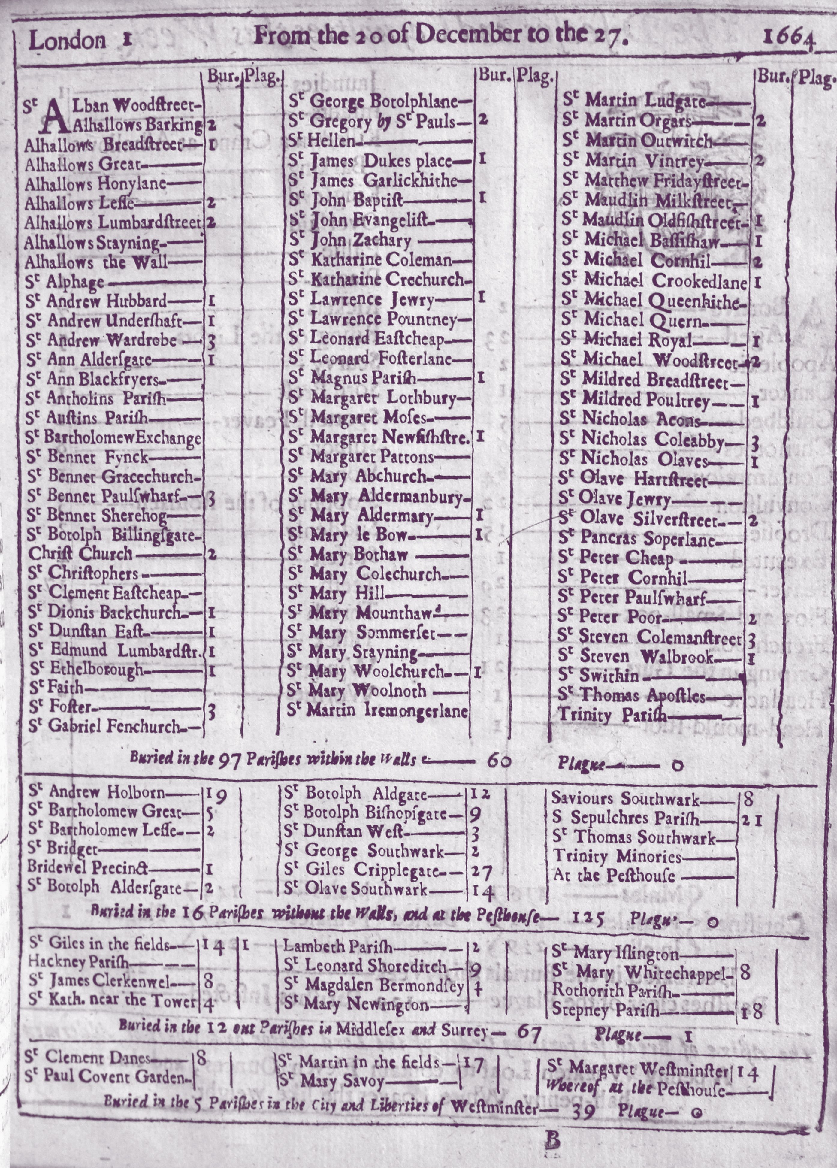 Although Samuel Pepys was only confronted with the reality of the plague in early June 1665, the first victim fell in the Parish of St Giles in December 1664. The harrowing bills of mortality trace the inevitable spread of the pandemic ripping through London, reaching its peak in September 1665.