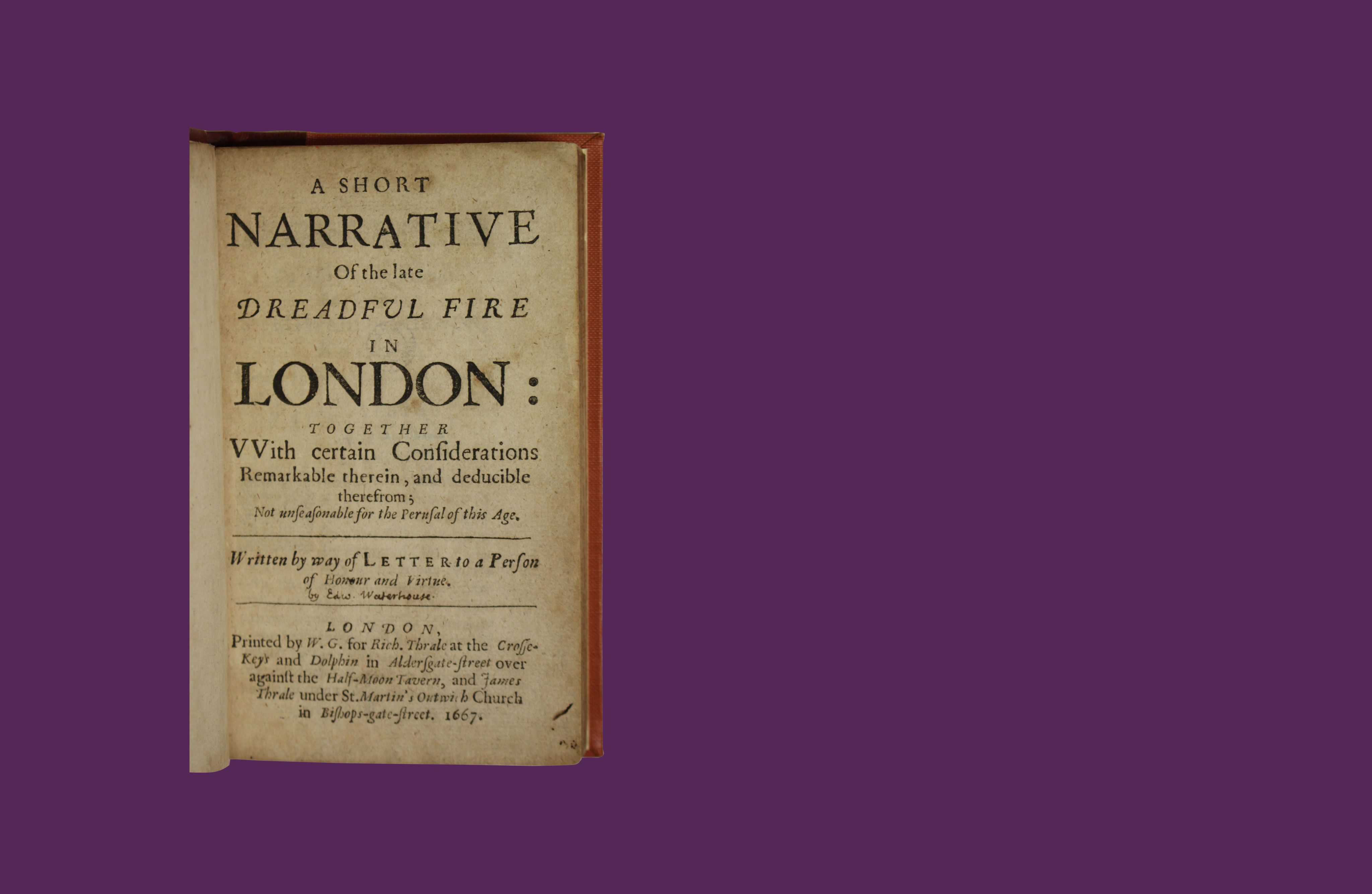 Edward Waterhouse, A short narrative of the late dreadful fire in London: together vvith certain considerations remarkable therein, and deducible therefrom; not unseasonable for the perusal of this age. London: printed by W[illiam]. G[odbid]. for Rich. Thrale …, 1667. DUL SB 0897