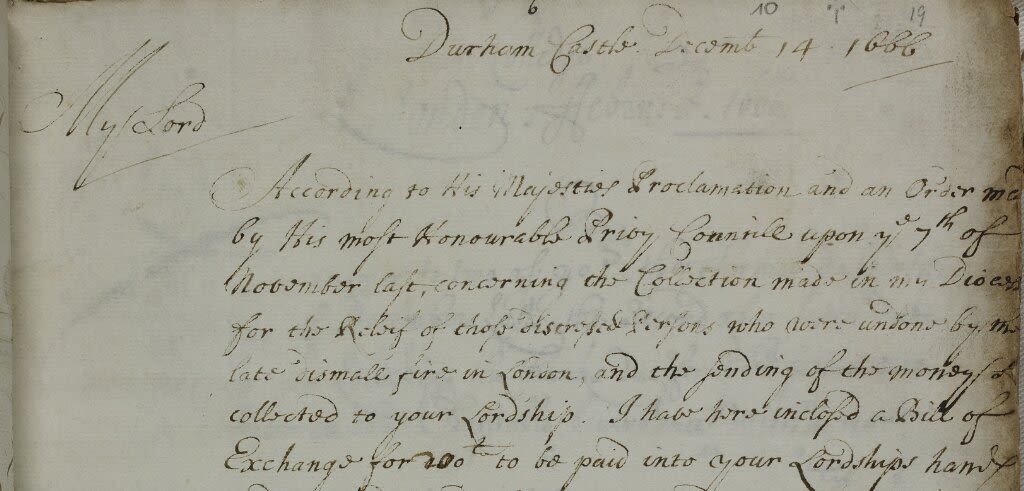 Once again, church attendees in the diocese of Durham were called upon to be generous in their donations. Not long after sending £40 to Cambridge for plague victims, Cosin was able to inform the Mayor of London that he had raised £200 for those affected by the Great Fire.