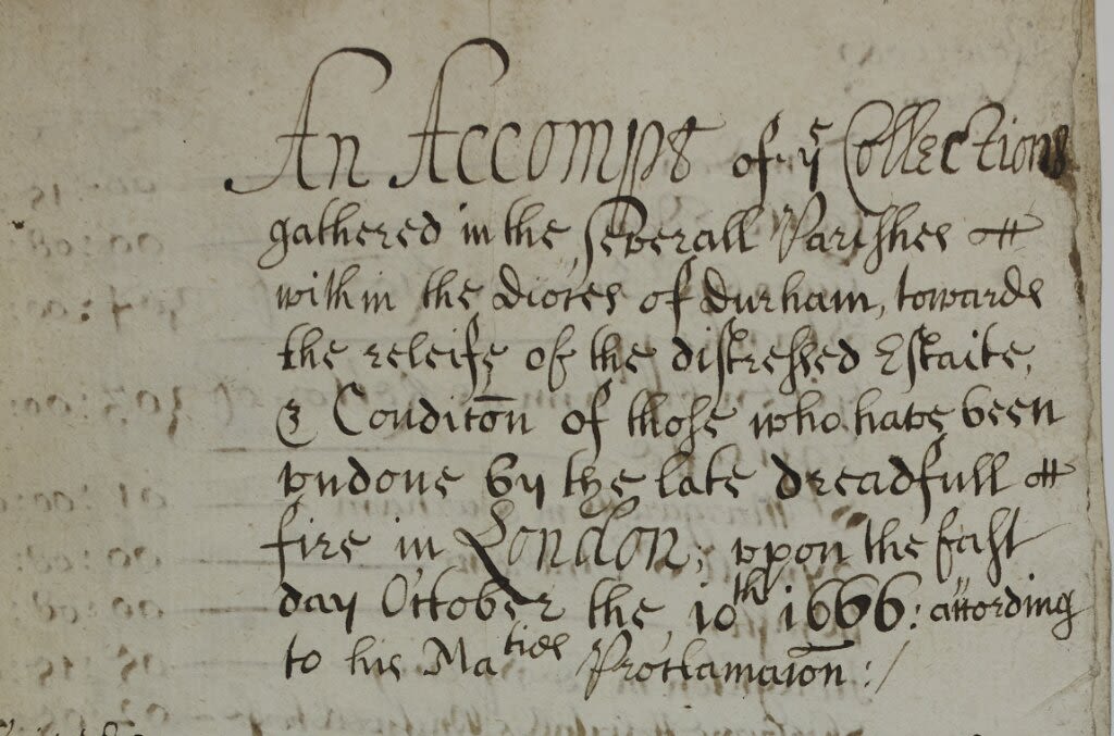 An Accompt of the Collections gathered in the severall Parishes within the Dioces of Durham towards the reliefe of the distressed Estaite and Condition of those who have been undone by the late dreadfull fire in London: upon the fast day October the 10th 1666: according to his Maties Proclamation. DUL MSP 20/12, p. 41.