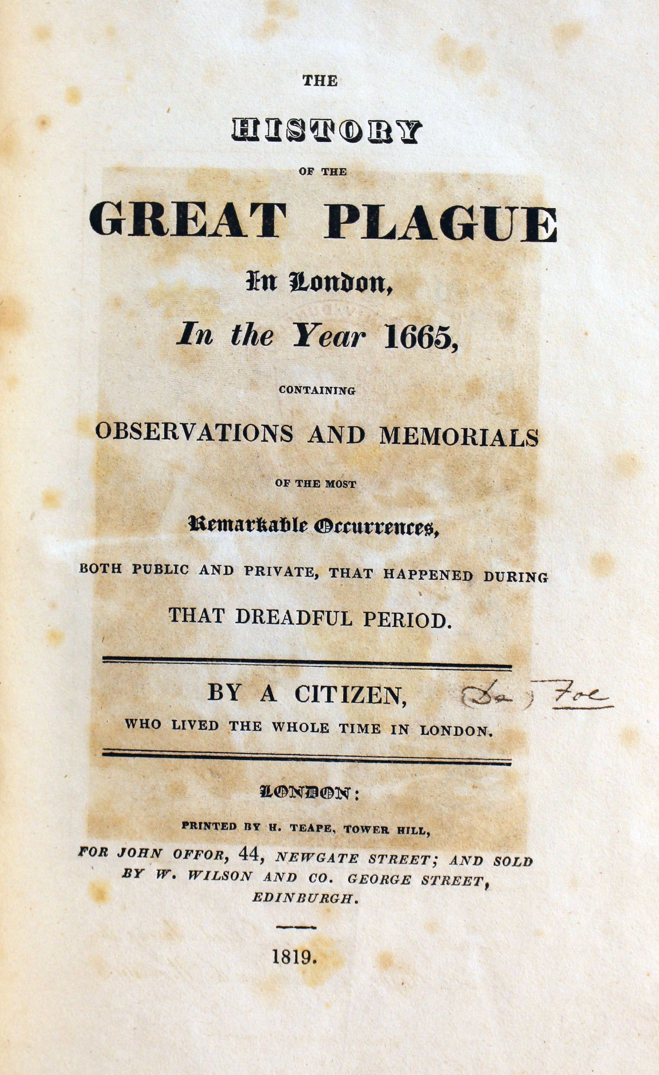 Daniel Defoe, The history of the great plague in London, in the year 1665, containing observations and memorials of the most remarkable occurrences … London: printed by H. Teape …, 1819 DUL Routh 49.K.5