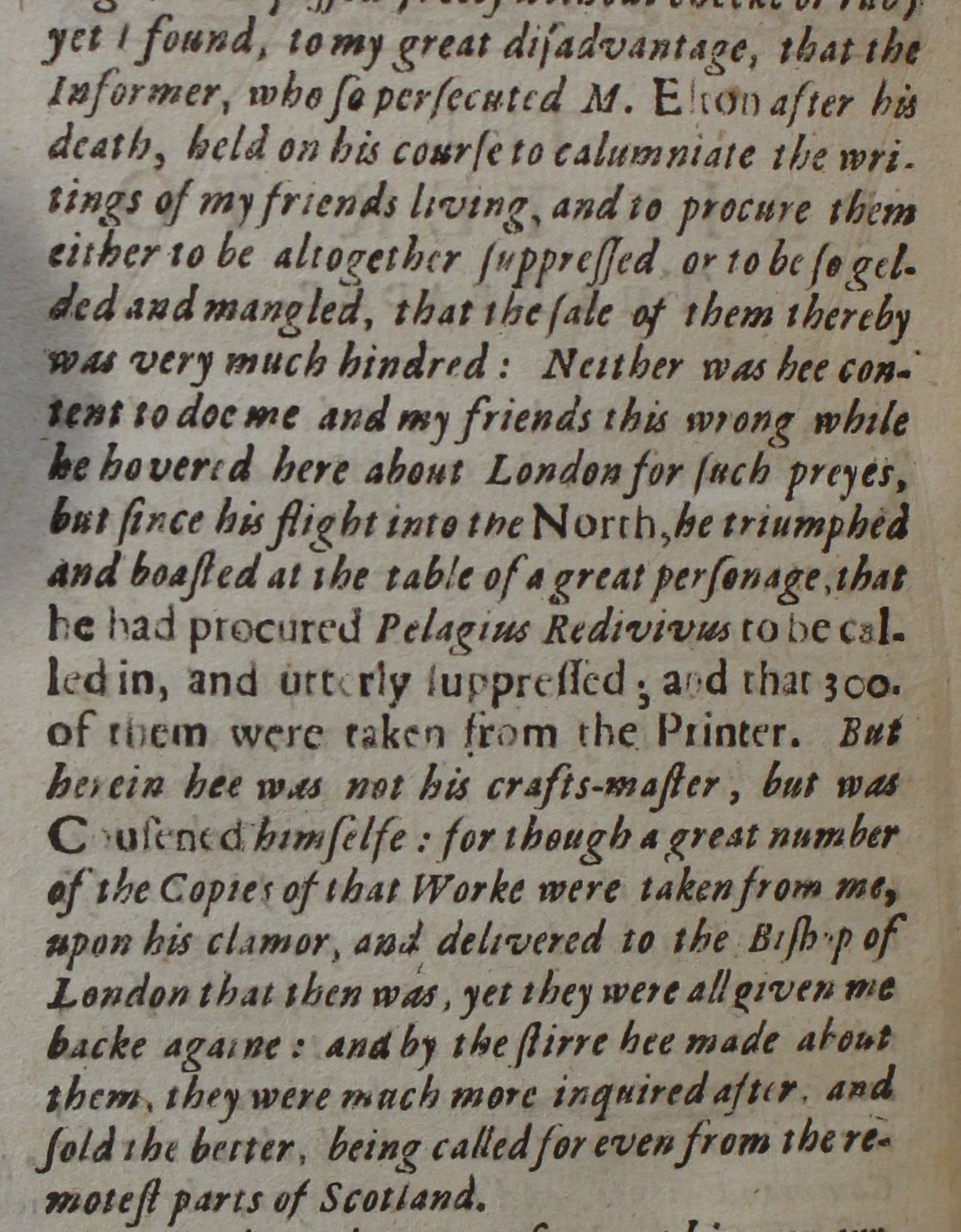 And were not the Dr’s [i.e. Featley’s] braynes made of the papp [pulp] of an apple that would allowe such stuff to the presse? It is well the books made a fire, though not all, I doubt. But they are not burned that made the books.