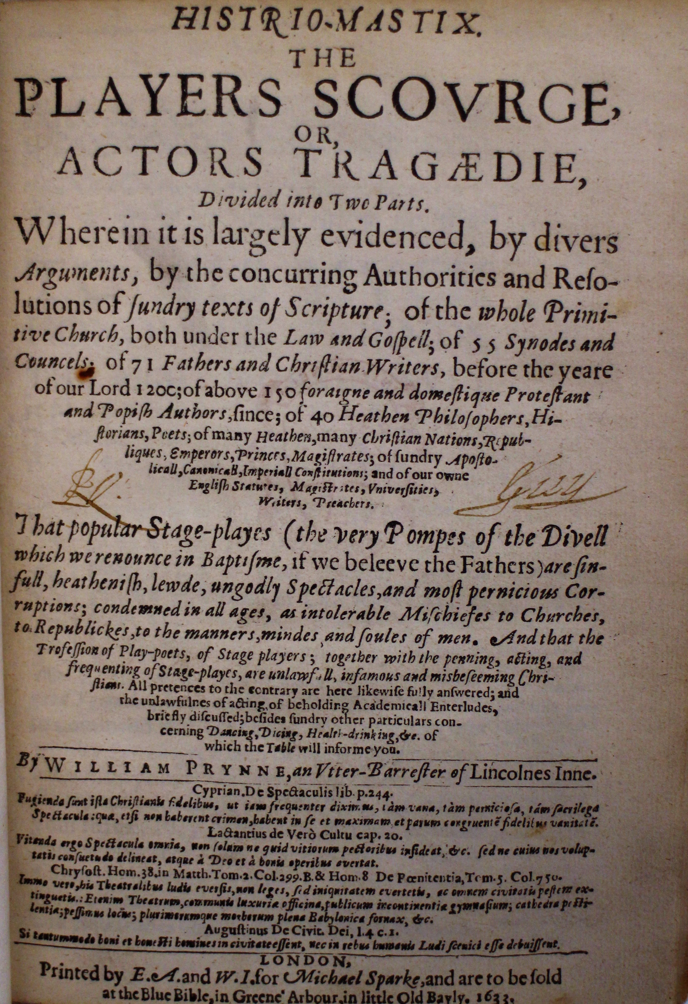 William Prynne, Histrio-mastix. The Player’s scourge, or, actors tragaedie divided into two parts. London: Printed by E.A. and W.I. for Michael Sparke, 1633. DUL Routh 12.E.4
