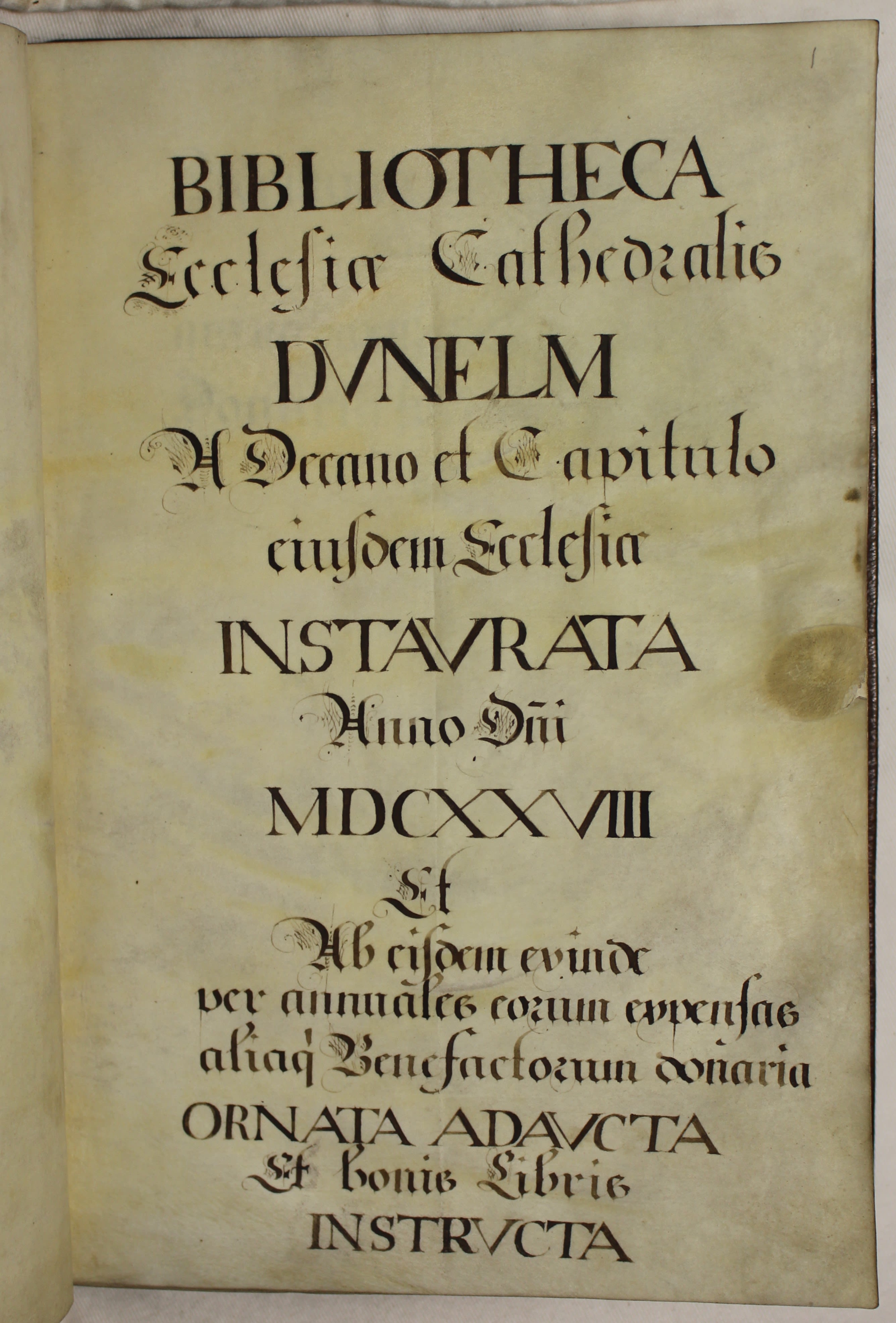 Bibliotheca ecclesiae cathedralis Dunelm a Decano et Capitulo eiusdem ecclesiae instaurata. Durham Cathedral Library MS A.iv.32, f. 1. Reproduced by kind permission of the Chapter of Durham Cathedral.