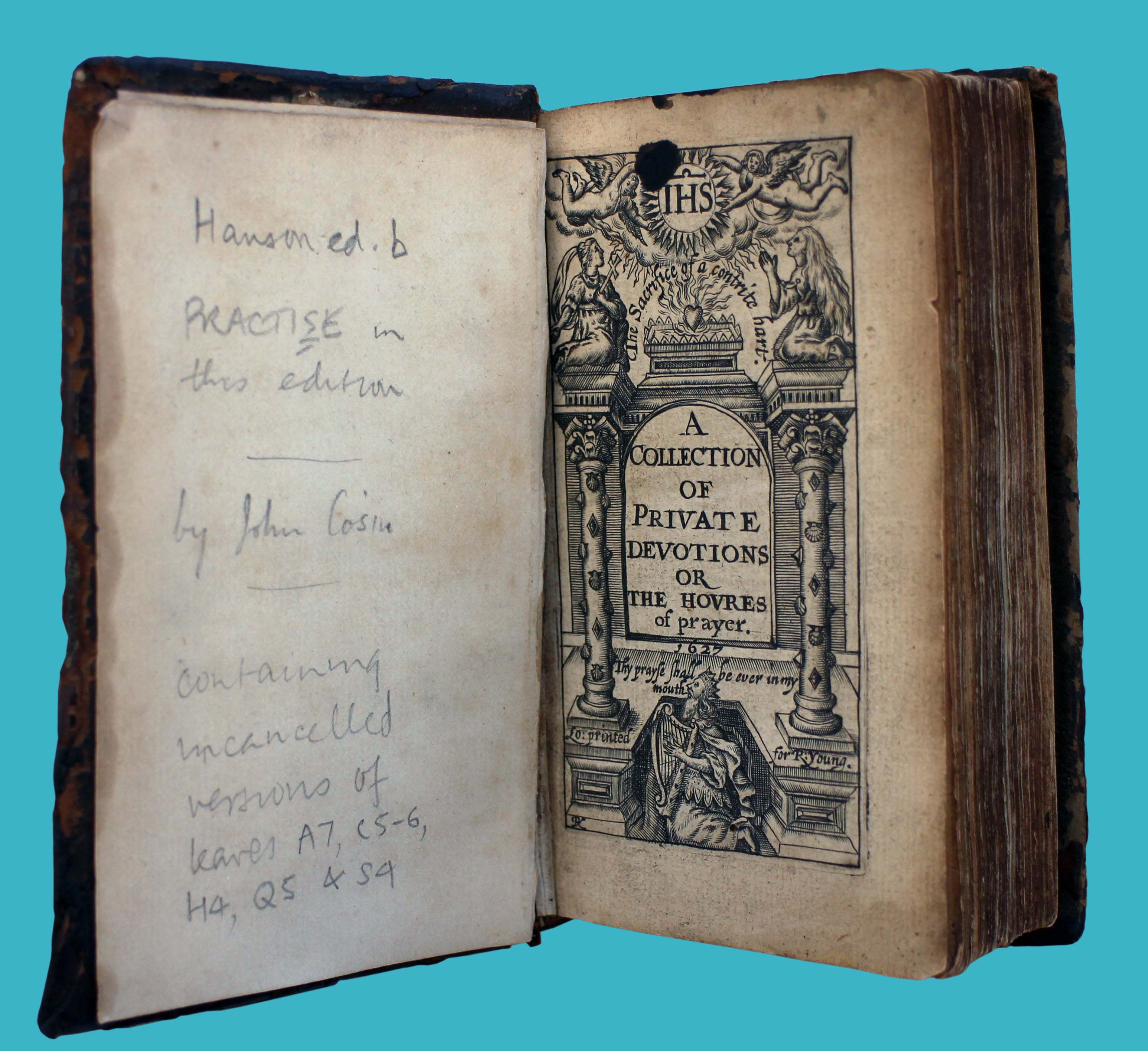 John Cosin, A collection of priuate deuotions: in the practise of the ancient church, called the houres of prayer. As they were much after this maner published by authoritie of Q. Eliz. 1560. Taken out of the Holy Scriptures, the ancient fathers, and the diuine seruice of our owne Church. London: Printed by R. Young, 1627. DUL SB 1877
