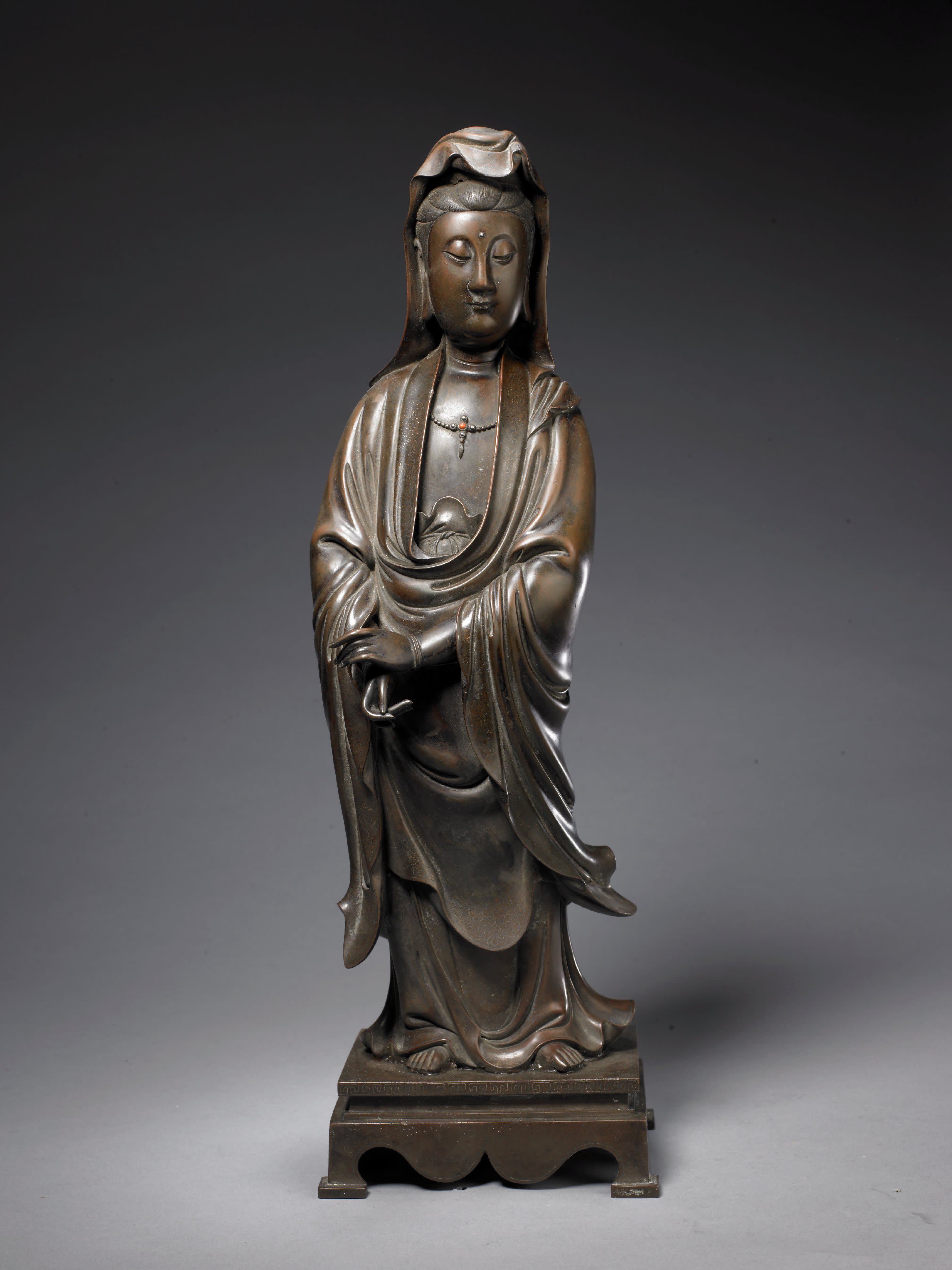 Guanyin statue, the first object registered under the Gu category. This large silver-inlaid bronze statue is inscribed with ‘Shisou’, the artist’s name. He was a renowned master of Buddhist statue casting who lived in the early 17th century of the late Ming dynasty. © Zhao Shan