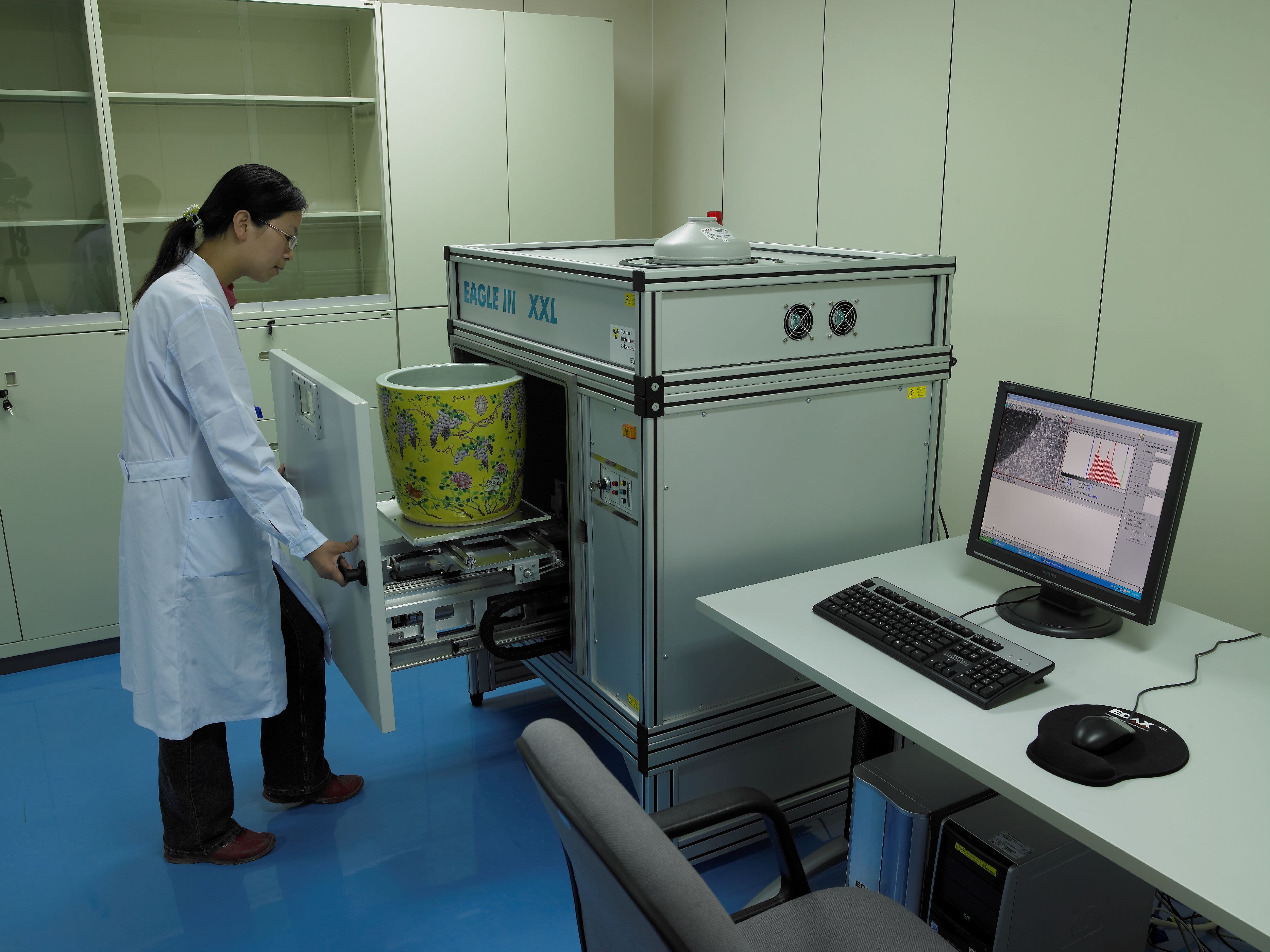 Using an X-ray fluorescence spectrometer to scan a large porcelain vessel in the laboratory. This machine has an especially large chamber to accommodate sizeable objects in the museum collection. Known as the ‘Object Hospital’, the Palace Museum has the largest conservation and scientific research labs in China with over 100 professionals and the most advanced research facilities. © Liu Mingjie