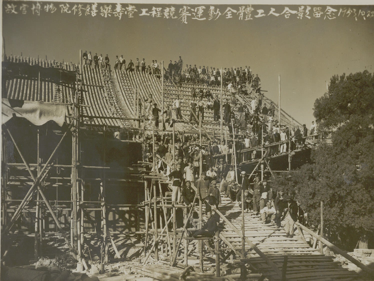During a project to restore the Leshou Tang (Hall of Joyful Longevity), a Construction Competition Campaign was organised, fostering collective effort and collaboration, as well as promoting cultural heritage as a symbol of national pride. The entire workforce poses for a commemorative photograph at the Campaign in 1953. © The Palace Museum