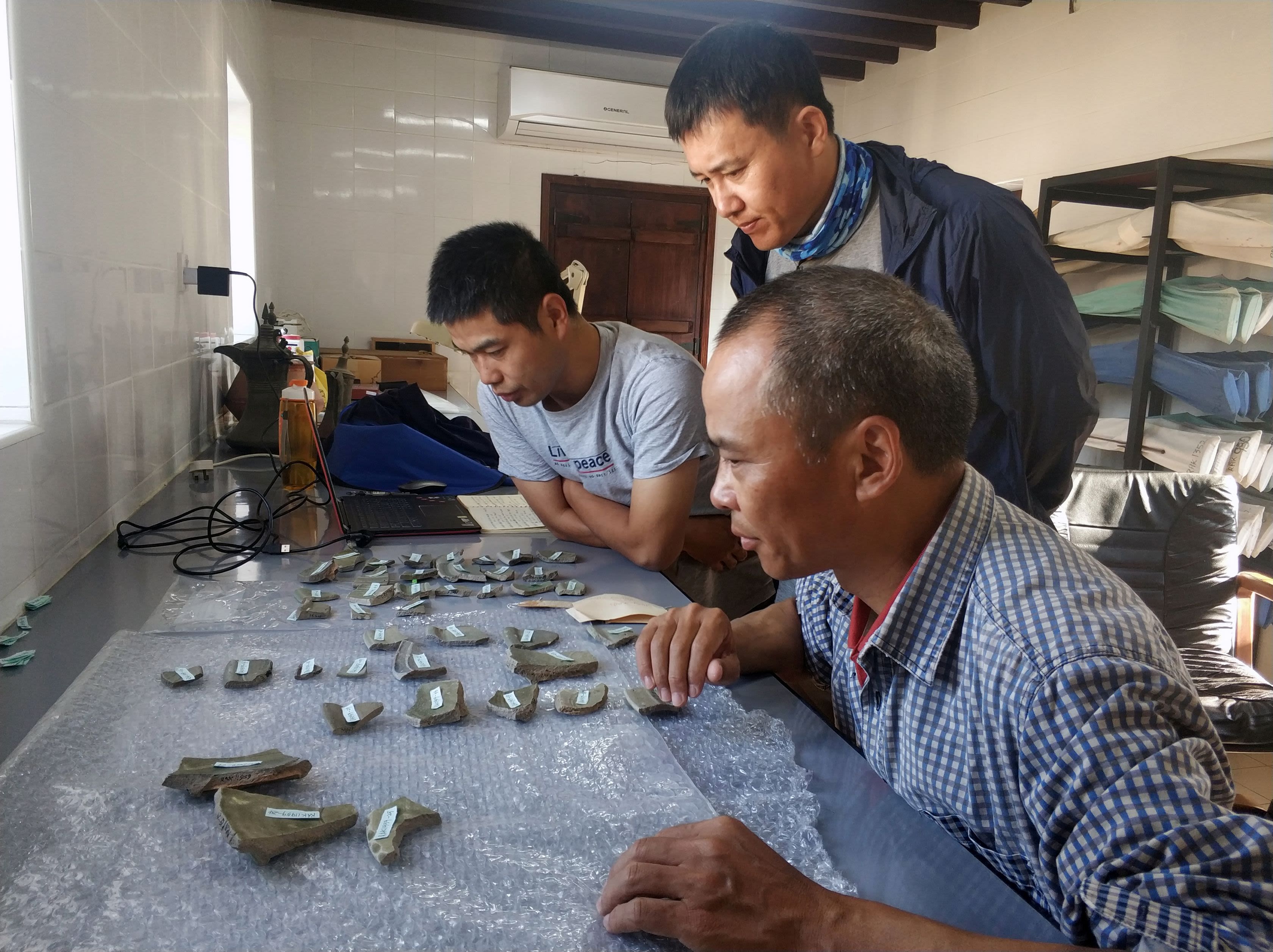 The joint archaeological team from the Palace Museum, Durham University, and Jilin University studying fragments of 15th-16th century Thai and Vietnamese celadon at the Ras al-Khaimah National Museum. They were excavated from the Al-Mataf site in 2019. This discovery reveals the rich diversity of finds from the site, demonstrating the cosmopolitan nature of the Indian Ocean trade, together with the economic and cultural exchanges between different civilisations of the period. © Zhang Ran