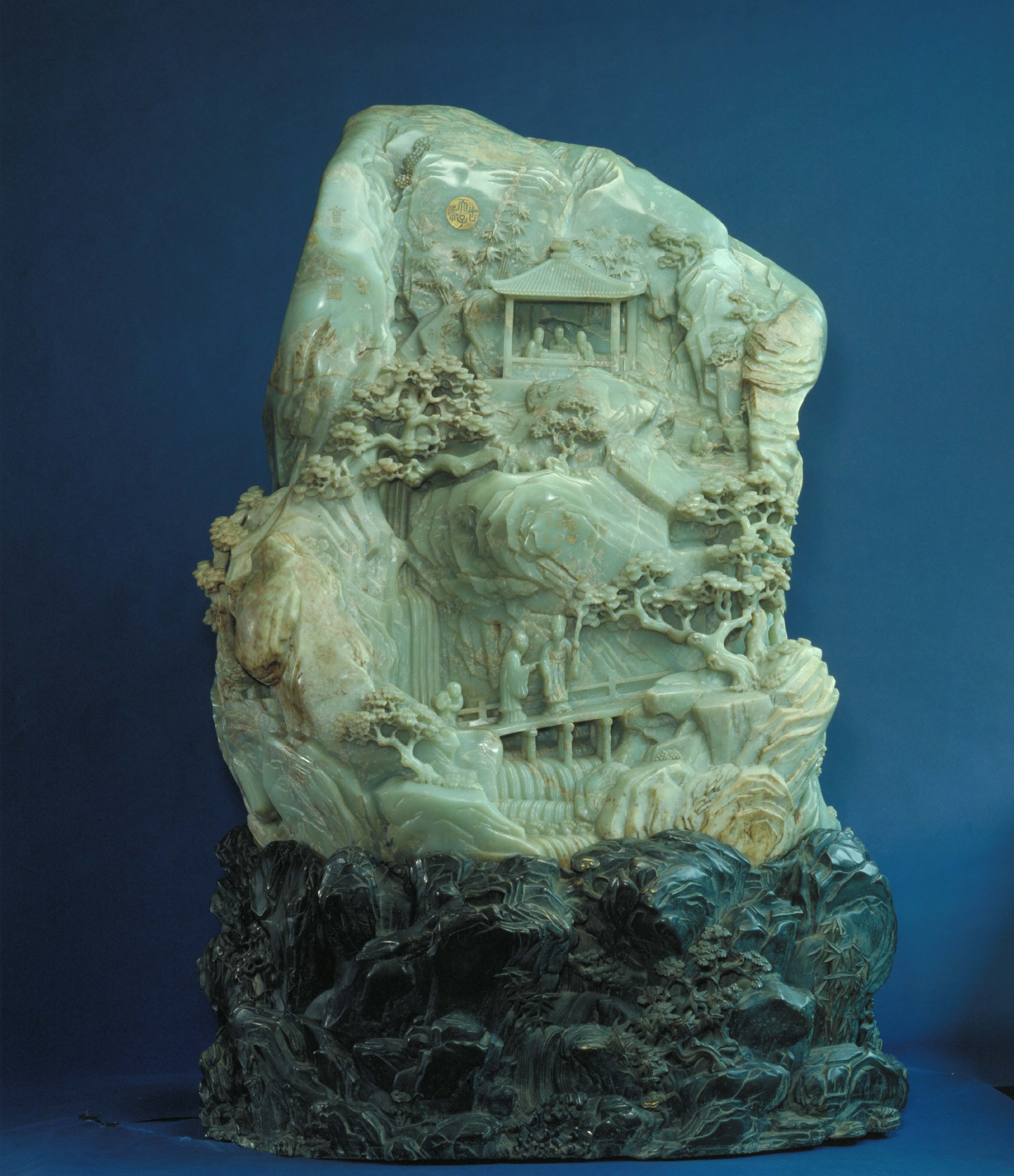 Jade boulder titled The Nine Elders of Huichang. It is over one metre high and weighs over 820 kilos. It represents an elegant gathering of nine scholarly friends in the spring of 845 CE of the Tang dynasty. This jade mountain is a grand monument that celebrates the ideal of scholarly virtue. © Hu Chui