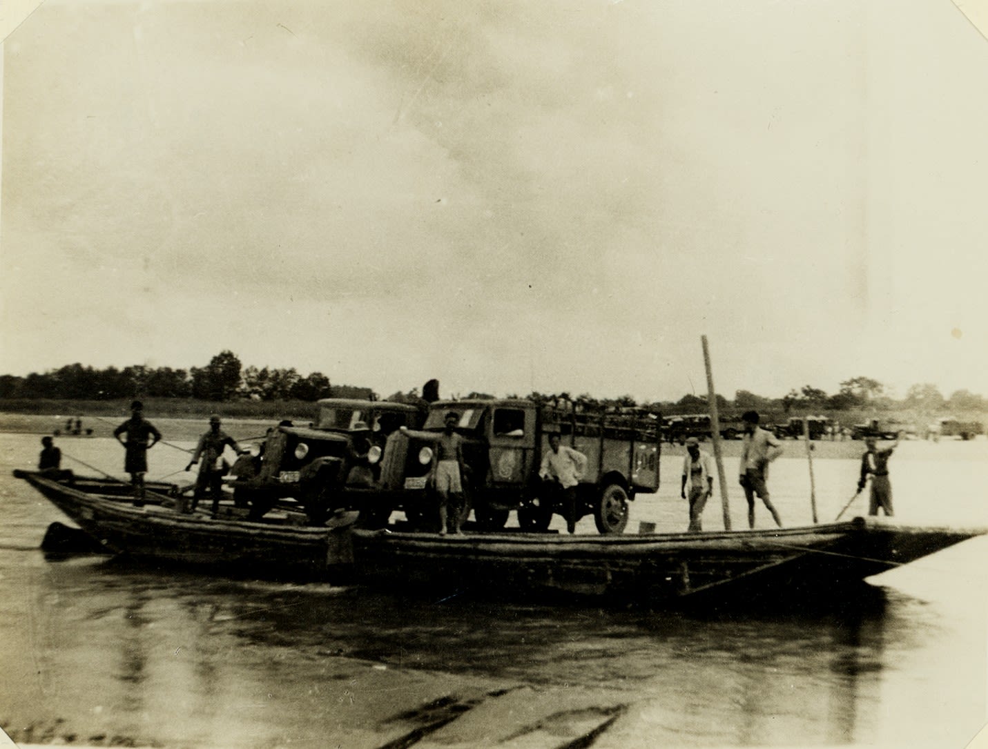 Two lorries with collections on a ferryboat across a river. Due to the short notice and the need to move fast ahead of the Japanese military advancement, small local wooden boats were hired for transporting the vehicles in batches.