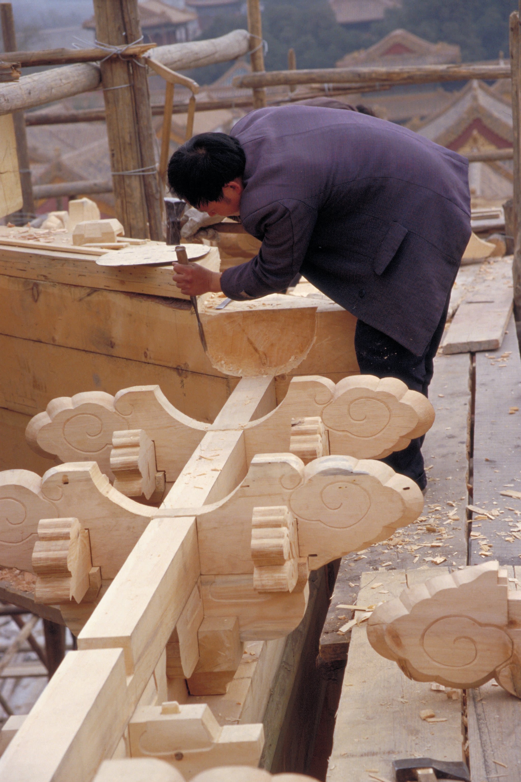 This photograph shows the carving of a wooden ornament by a skilled carpenter. Carpentry is part of the Official-Style Historic Architectural Craftsmanship, also known as the ‘Eight Trades’, consisting of Earthworks, Masonry, Scaffolding, Carpentry, Tilework, Painting, Color Painting, and Papering. It represents a comprehensive and strictly regulated system of traditional official-style construction techniques. Follow the link to watch a short 8-part documentary. © Liu Zhigang