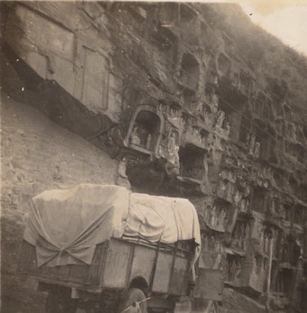 Lorries with collection crates driving past Qianfo Ya (Cliff of Thousand Buddha) in Leshan, Sichuan province, 1939.