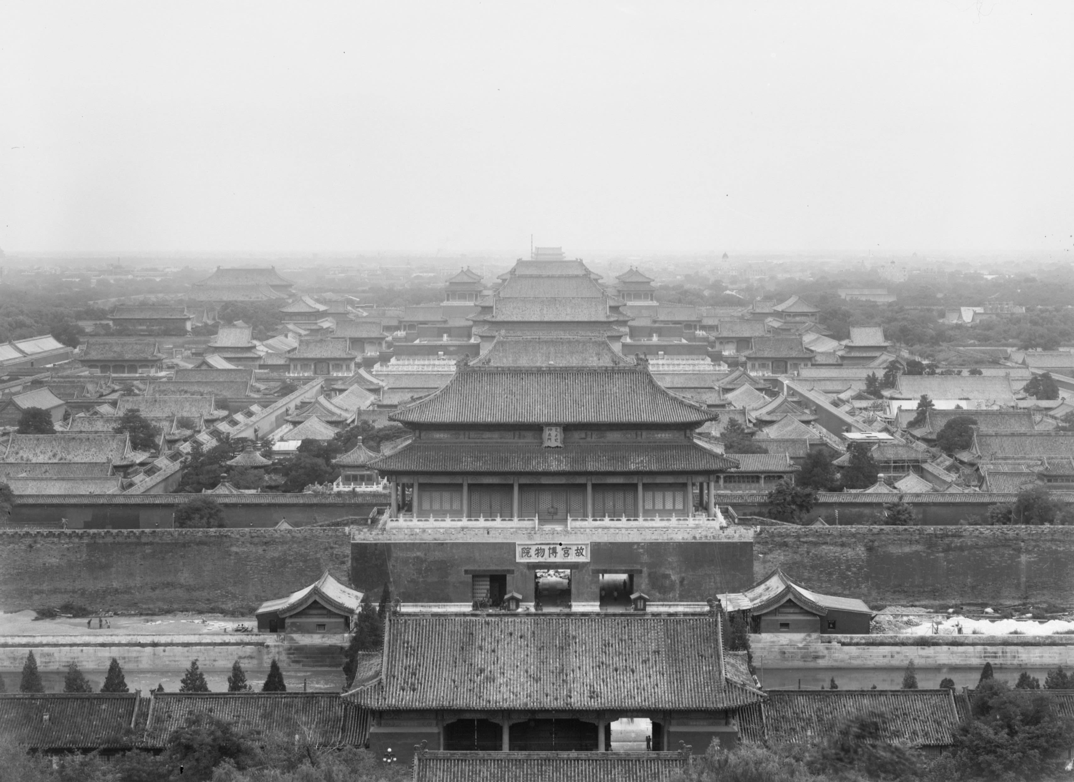 Bird’s eye view of the Palace Museum in the 1920s from the north. The name plaque of the Palace Museum in elegant calligraphy features prominently on the Shenwu Men (Gate of Divine Prowess). © The Palace Museum