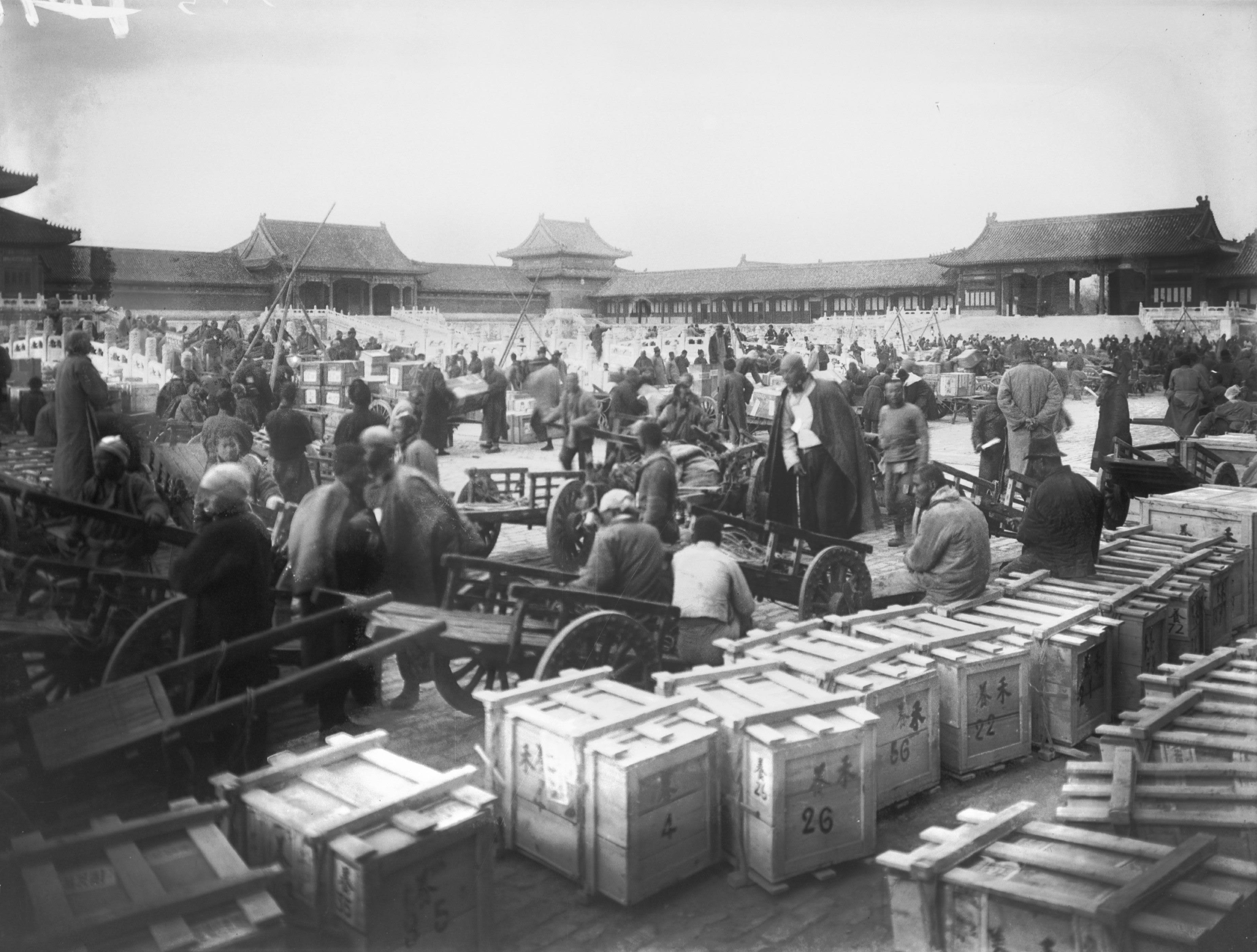 The vast courtyard in front of the Taihe Men (Gate of Supreme Harmony). In 1933, it was filled with crates, people and carts. This photograph shows the third batch of collections being loaded onto carts for departure.