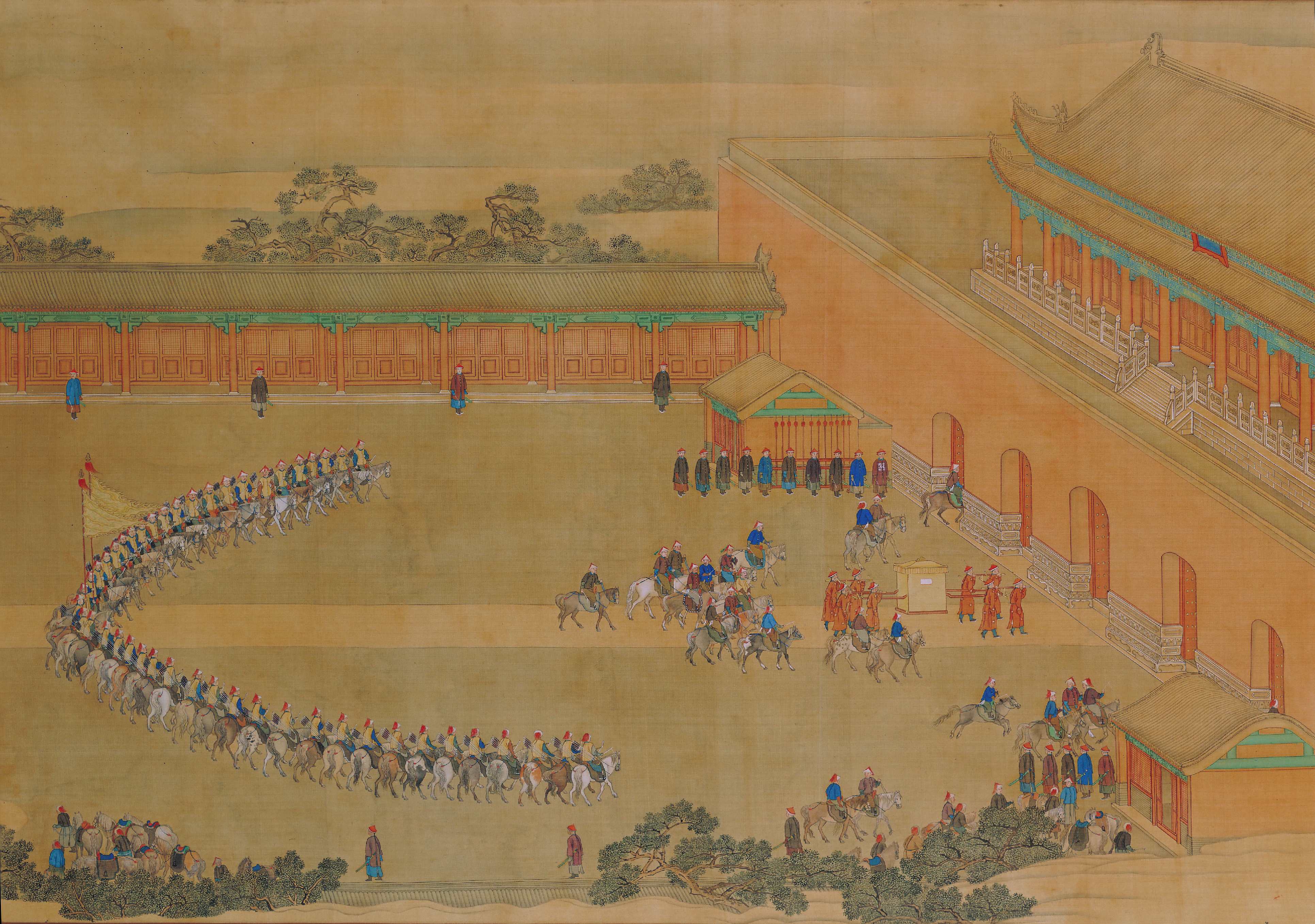 Handscroll titled The Qianlong Emperor’s Southern Inspection Tour (12th volume) was a significant donation by Jin Jiashen in 1984. Painted by court artist Xu Yang, the series documents Emperor Qianlong’s southern tours in the year 1751. This photograph is a section of the silk handscroll showing the imperial tour entourage returning to the Forbidden City. © Liu Zhigang