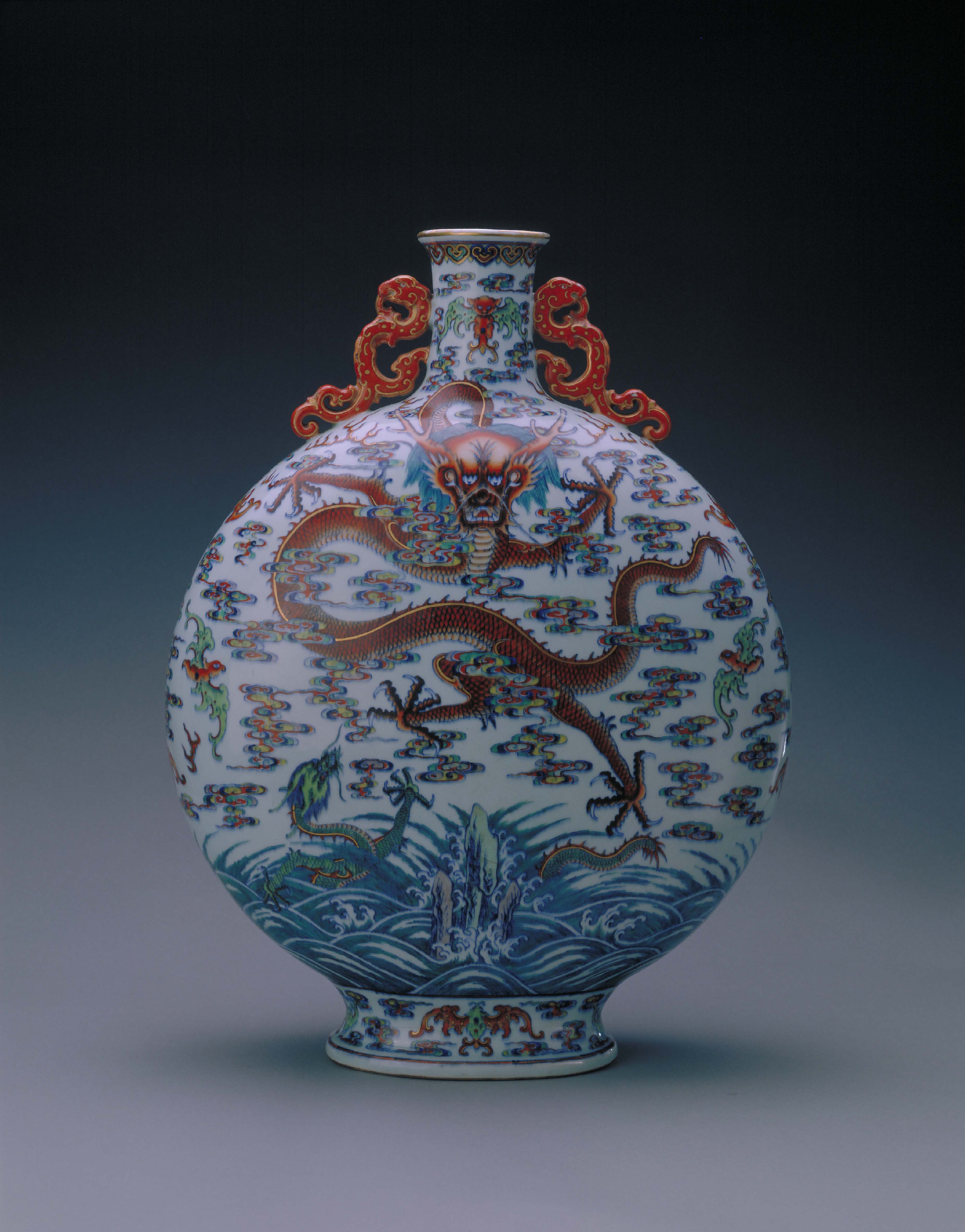 Porcelain moon flask with dragons among clouds and bats above rocks and waves. This flask is decorated with underglaze blue and overglaze enamels and gilding. It is a fine example of a decorative piece as part of a pair for use in palace rooms. © Liu Zhigang