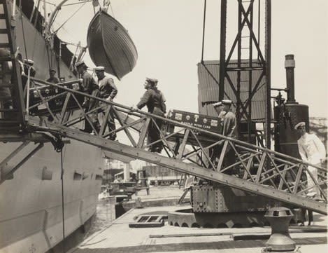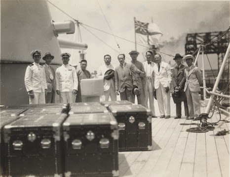 Group photo of Captain Errol Manners, museum staff, Chinese government representatives, and collection crates on the deck of HMS Suffolk. Fourth from the left is Ma Heng, Director of the Palace Museum. The objects and related paperwork were packed in bespoke crates, ensuring protection from dampness and stormy weather. The journey took 48 days across over 10,000 nautical miles. © The Palace Museum