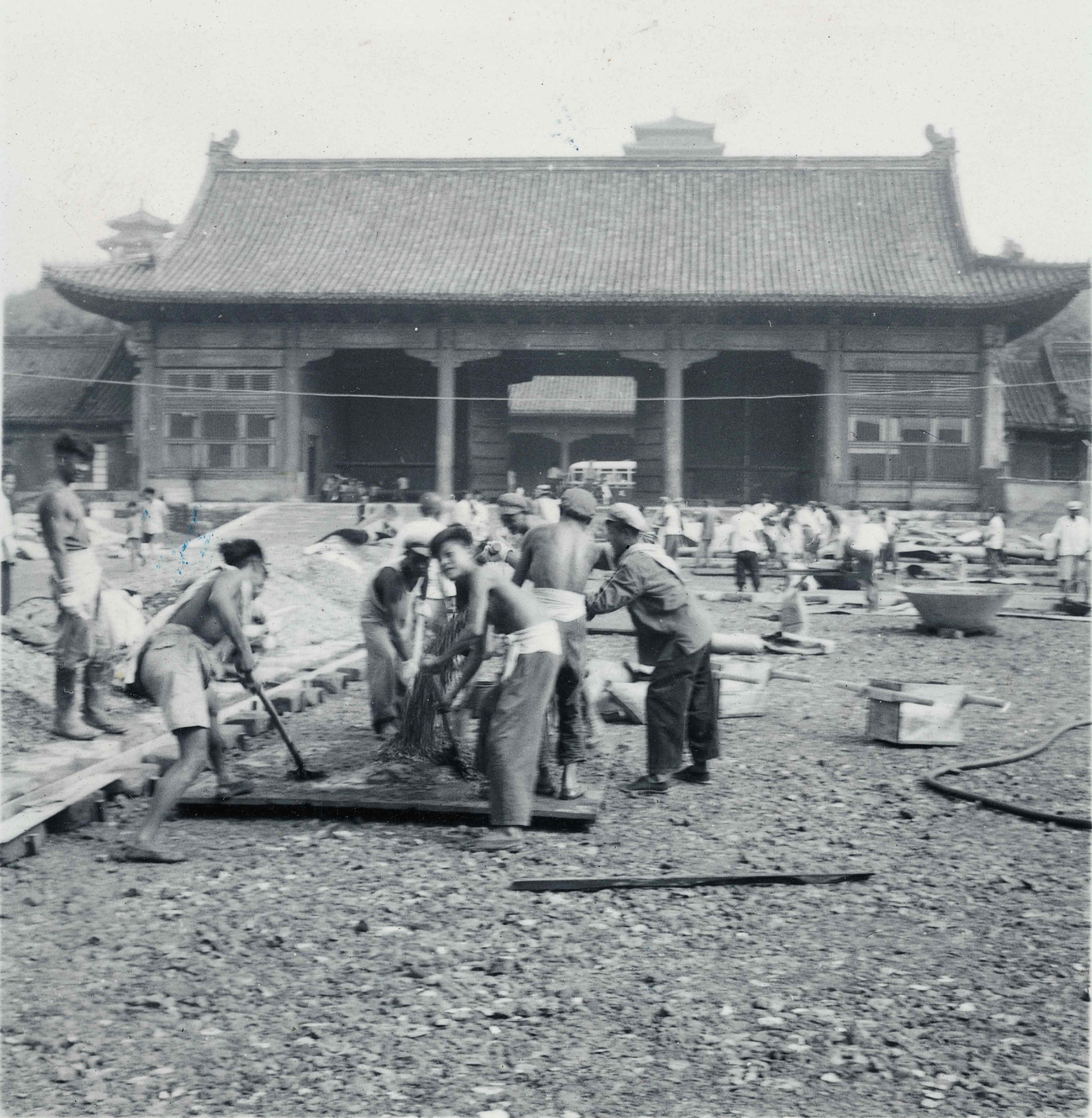 Not just the historic buildings suffered, but also the pavements within the Museum. This photograph captures workers labouring hard to resurface the road. © The Palace Museum