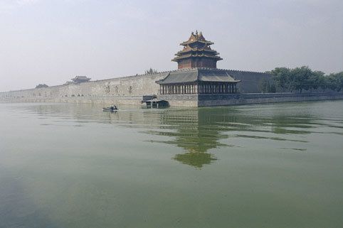 The restored moat, a view of the Northeastern Corner Tower in 1999. The moat is the wide defensive water channel that encircles the Forbidden City. The Palace Museum carried out extensive moat restoration and management work throughout the 1990s. © The Palace Museum