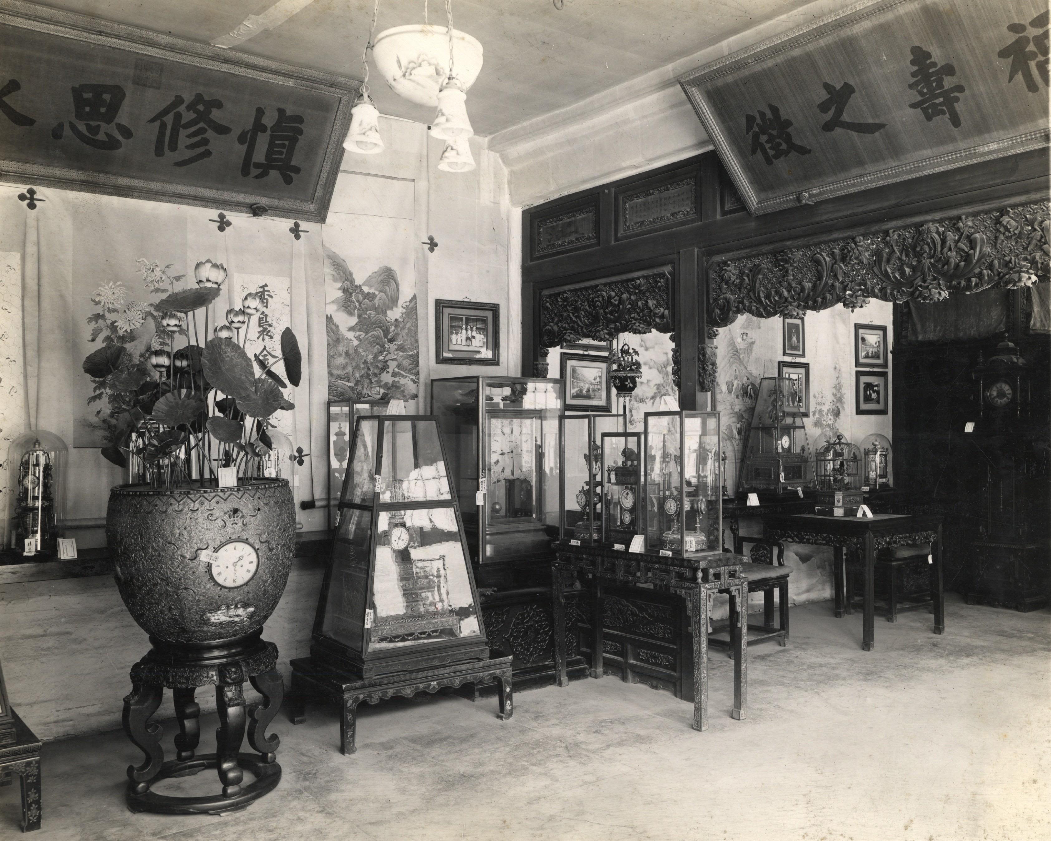 Gallery of clocks at the Tongshun Zhai (Study of Harmonious Accord) at the Antiques Exhibition Institute. The Institute displayed collections from imperial retreats, such as Yihe Yuan (Summer Palace), while the Palace Museum showcased objects from the Forbidden City. © The Palace Museum