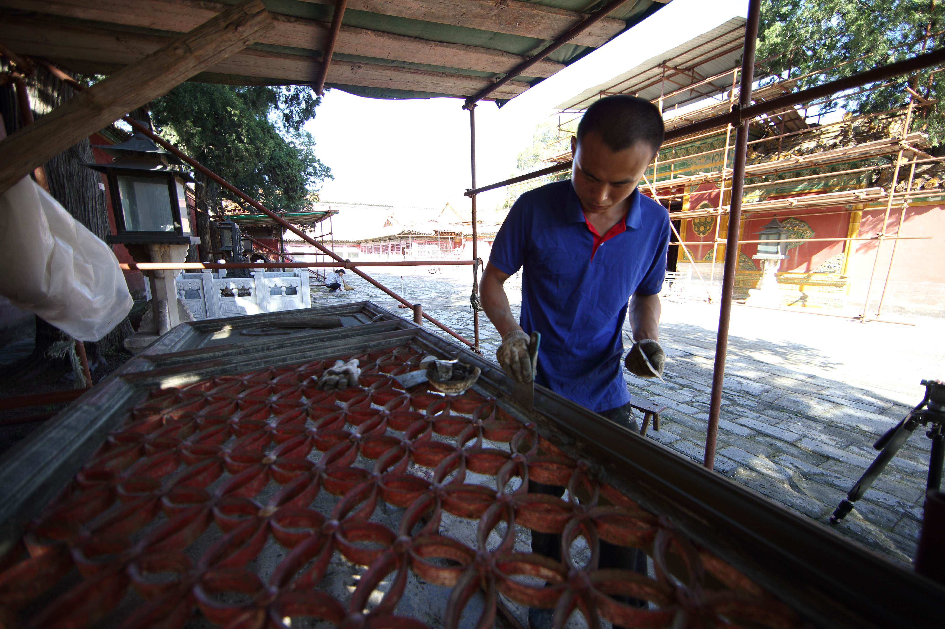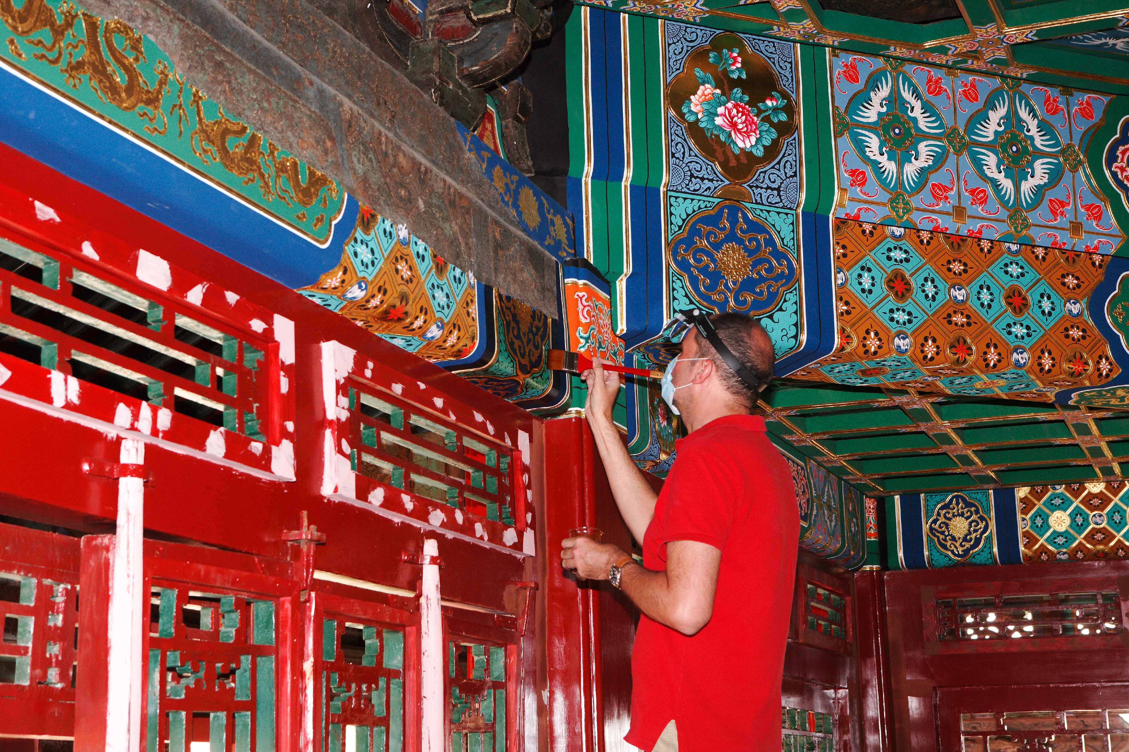 For the renovation project of the Yangxin Dian (Hall of Mental Cultivation), many experiments were carried out to revive lost craftsmanship, while scientifically analysing their durability and protective qualities. This photograph shows a staff member testing ground-layer oil decoration on a wooden frame. © Xiao Yi
