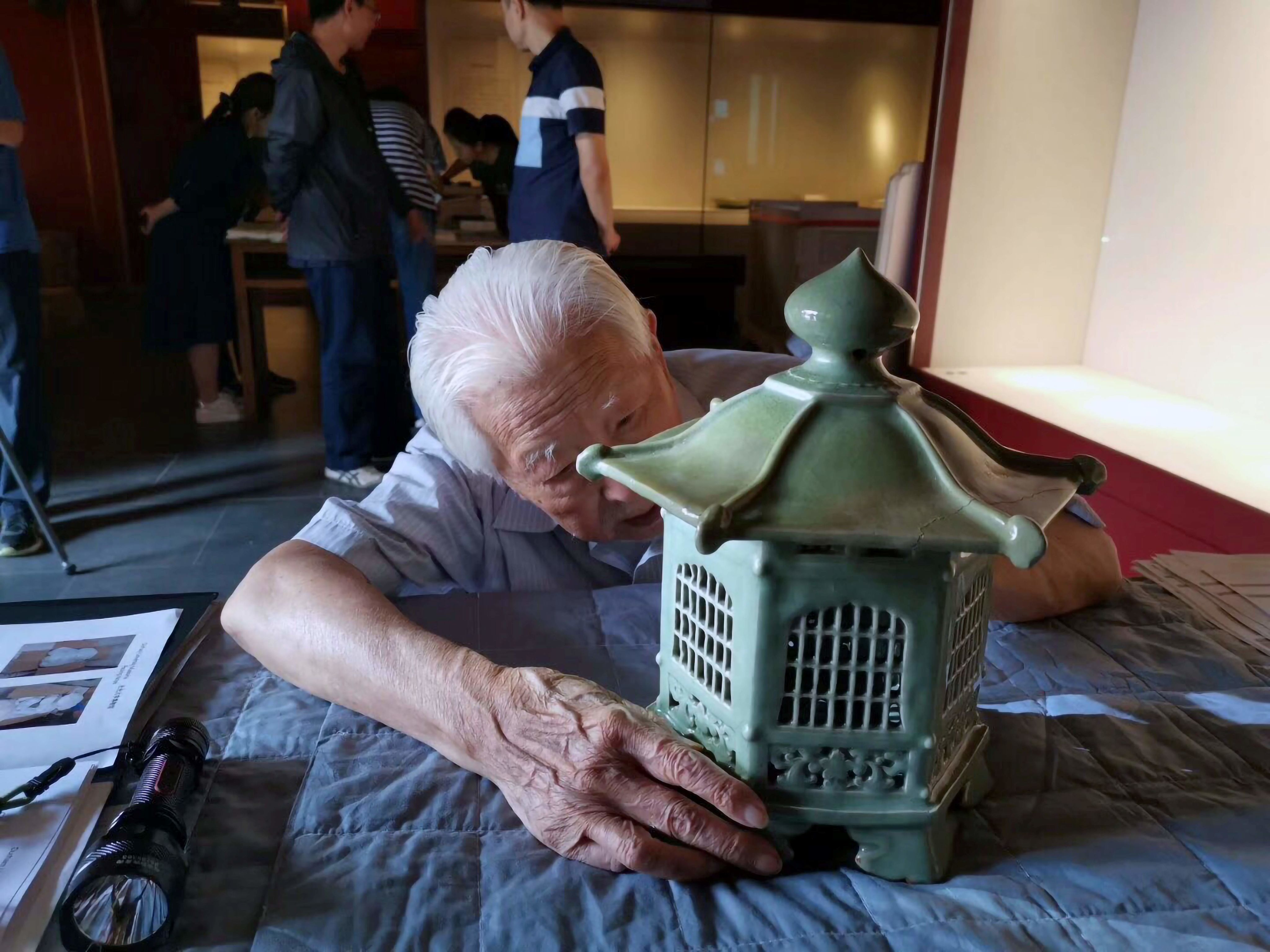 This photo shows the incense burner from the Oriental Museum being studied in preparation for the exhibition. The inspection was carried out by Geng Baochang, a professor at the Palace Museum aged 103. Mr Geng is a leading authority in ceramics. © Wang Guangyao