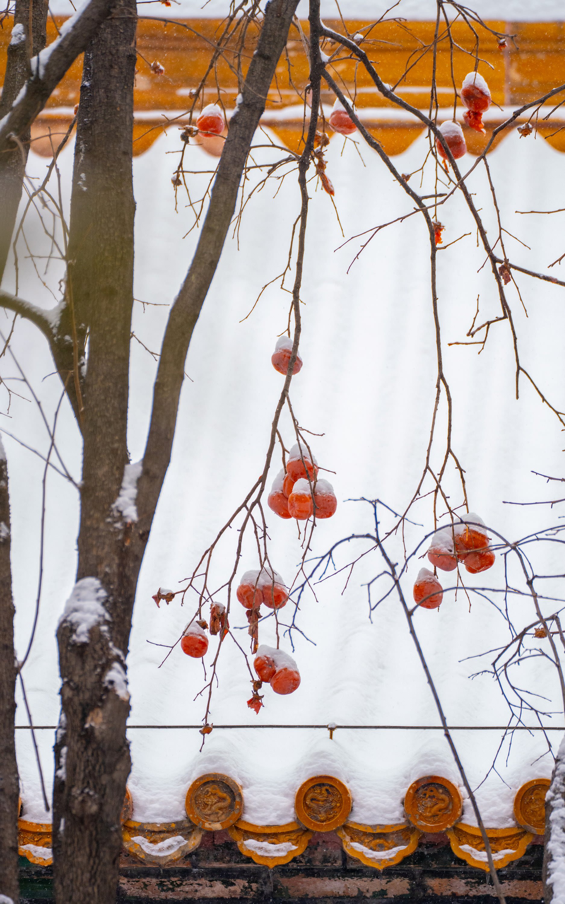 Persimmon tree with clusters of fruit in the winter snow. © Yu Ningchuan