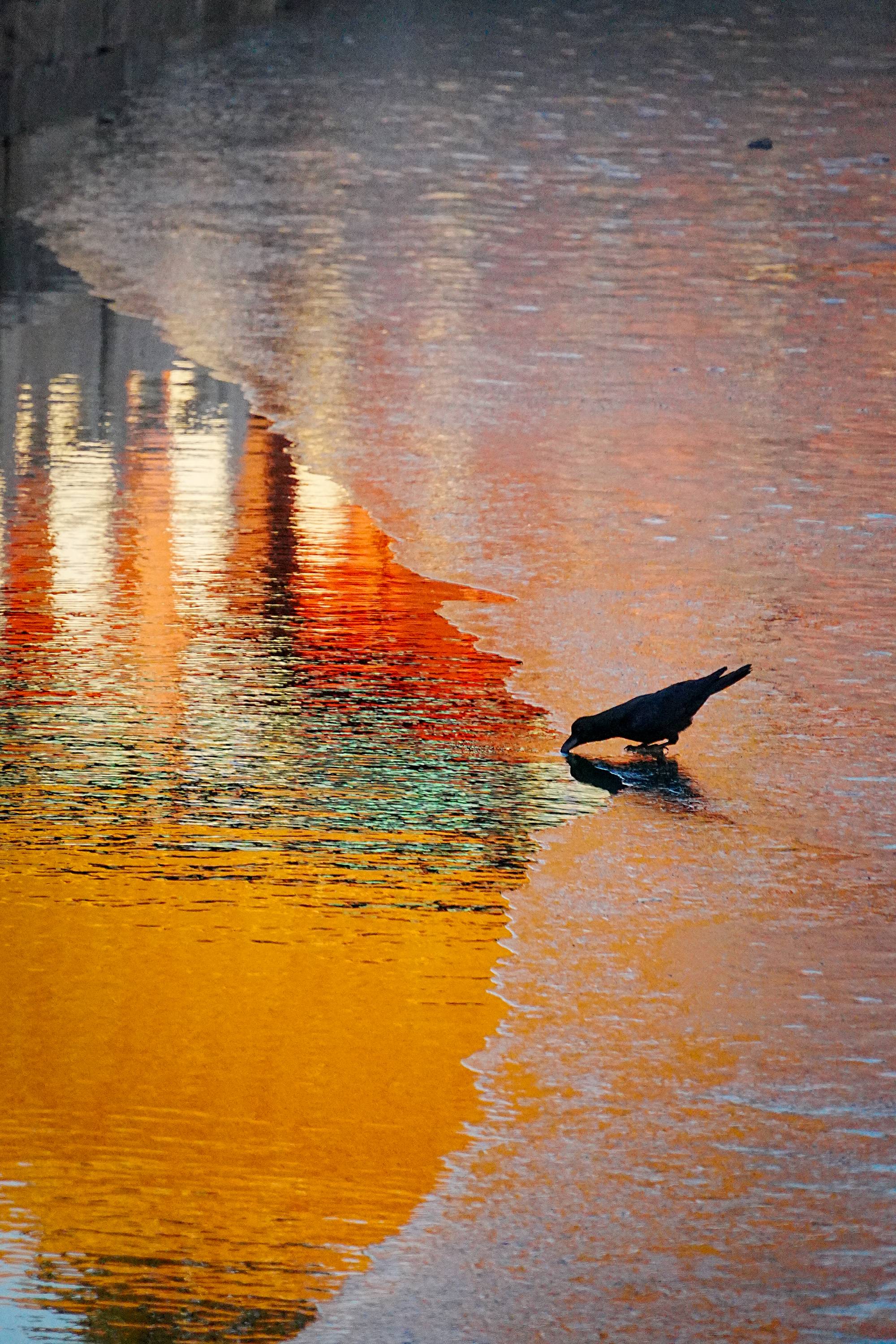 Crow drinking beneath the sunset’s shimmering reflection. © Guo Cong