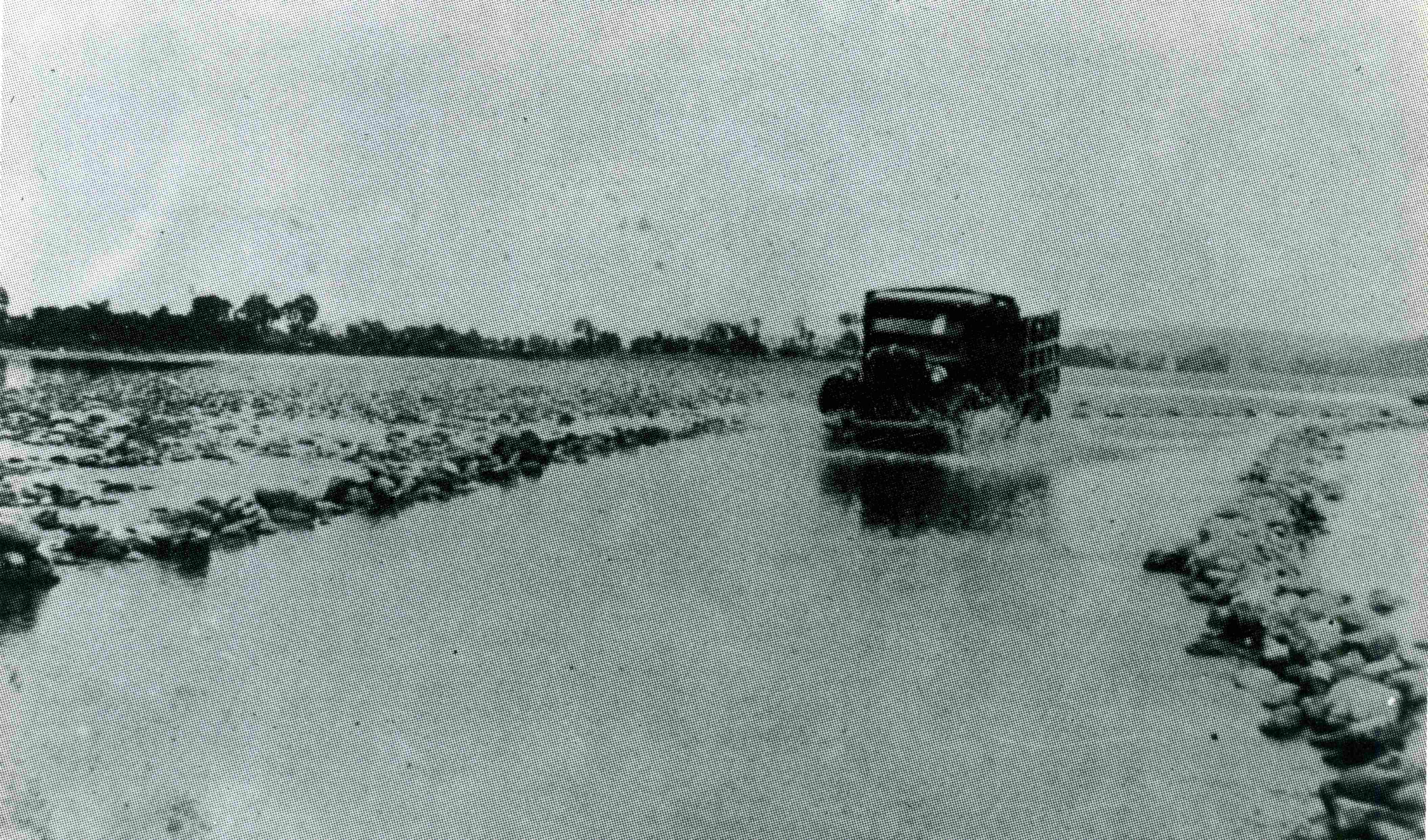 Lorries loaded with objects driving through deep water. The westward journey was fraught with danger.