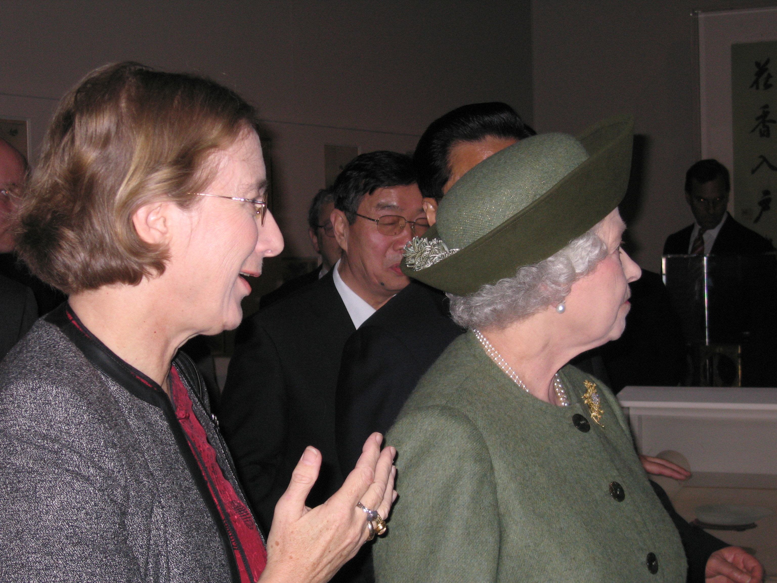 This photograph shows Queen Elizabeth II with lead-curator of the exhibition Professor Dame Jessica Rawson, a renowned sinologist and art historian. © Wang Zining