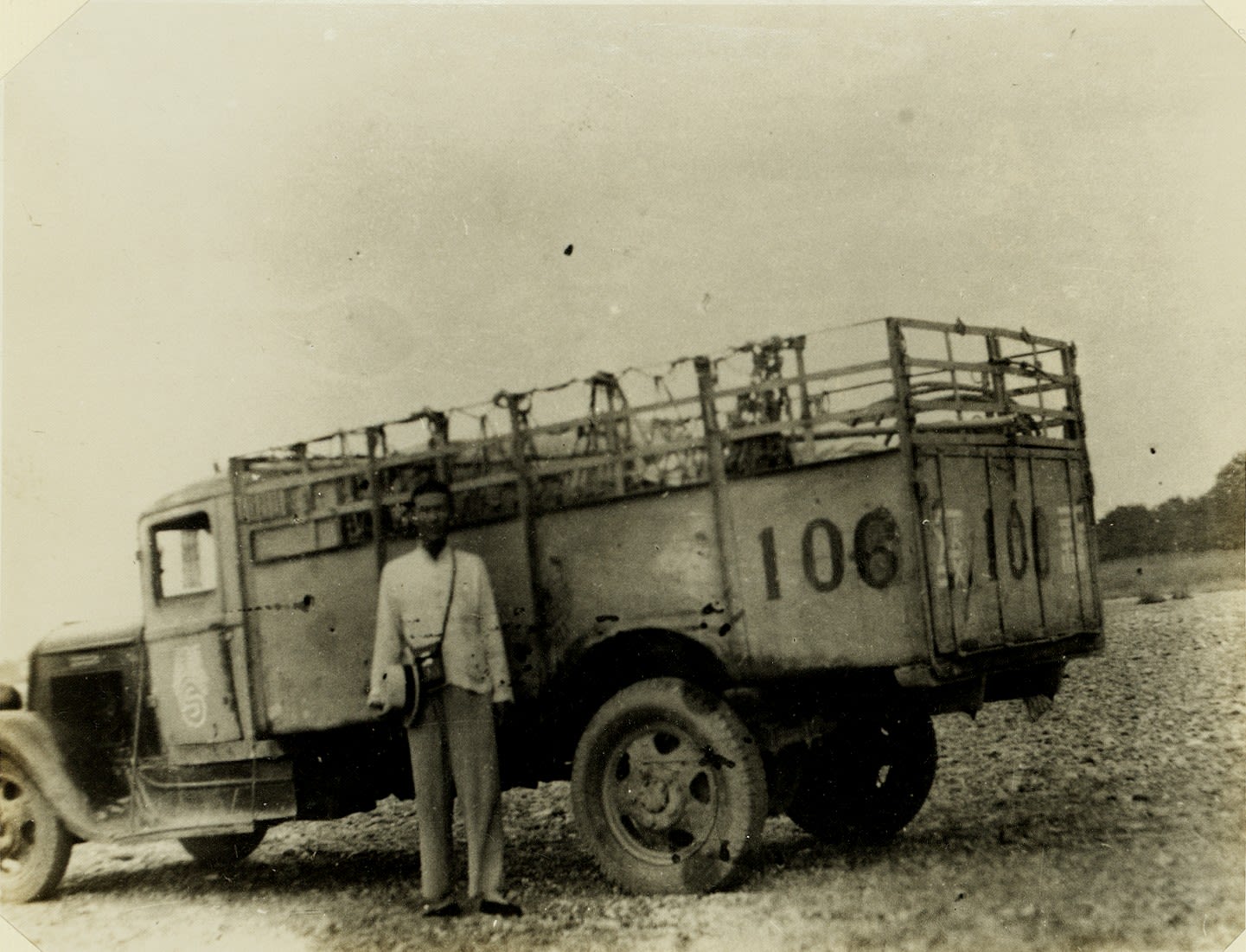 This photograph taken near Baoji shows Na Chih-Liang in front of a lorry with crates of objects during the westward evacuation. Mr Na (1908-1998) was a member of the Palace Museum staff who couriered large numbers of the collections to safety.