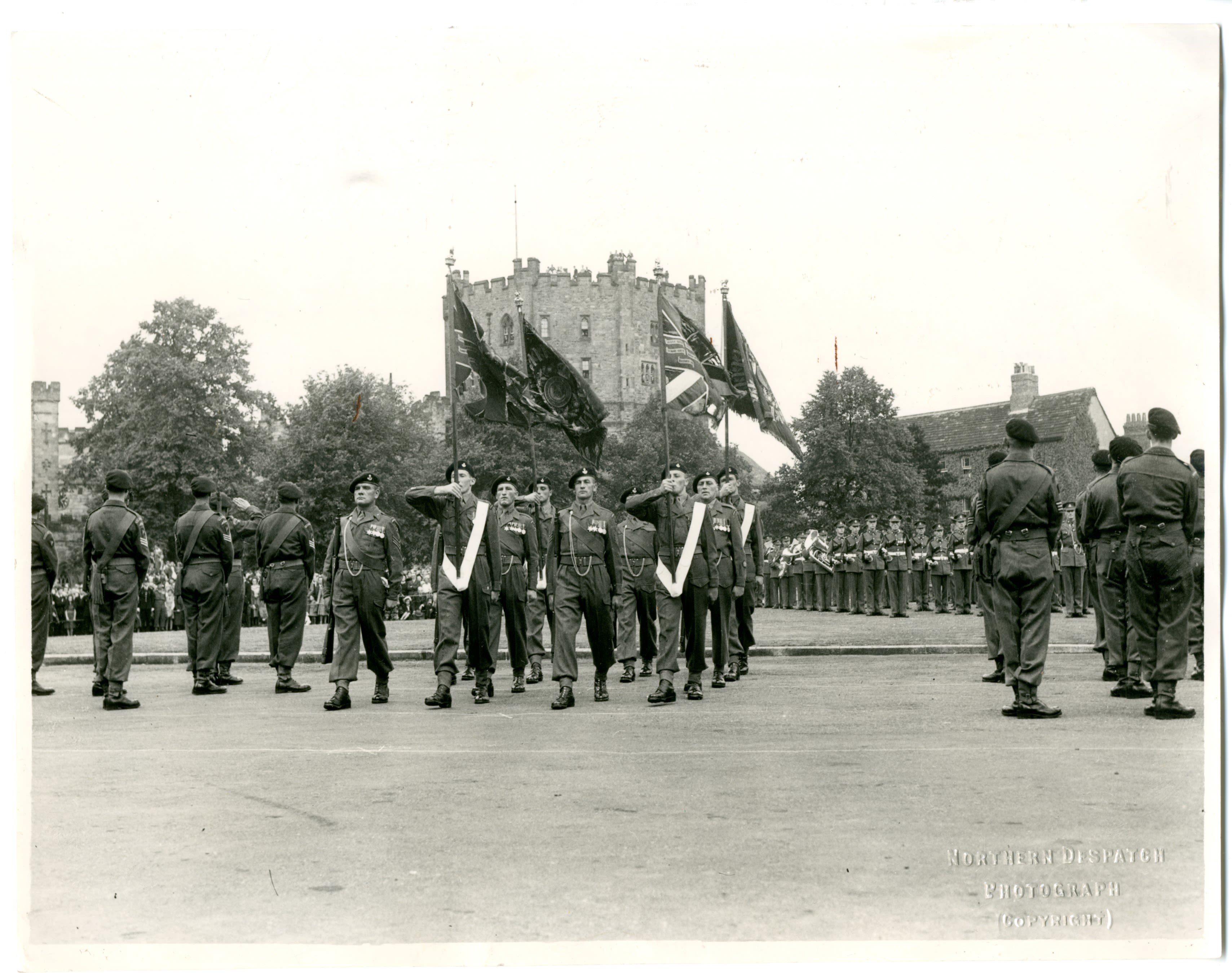 The final laying-up ceremony for the Colours of the DLI took place on 12 December 1968 at Durham Cathedral. All those present were asked to stand as the Colours passed by, with men in civilian dress required to remove their hats and all those in uniform to salute.