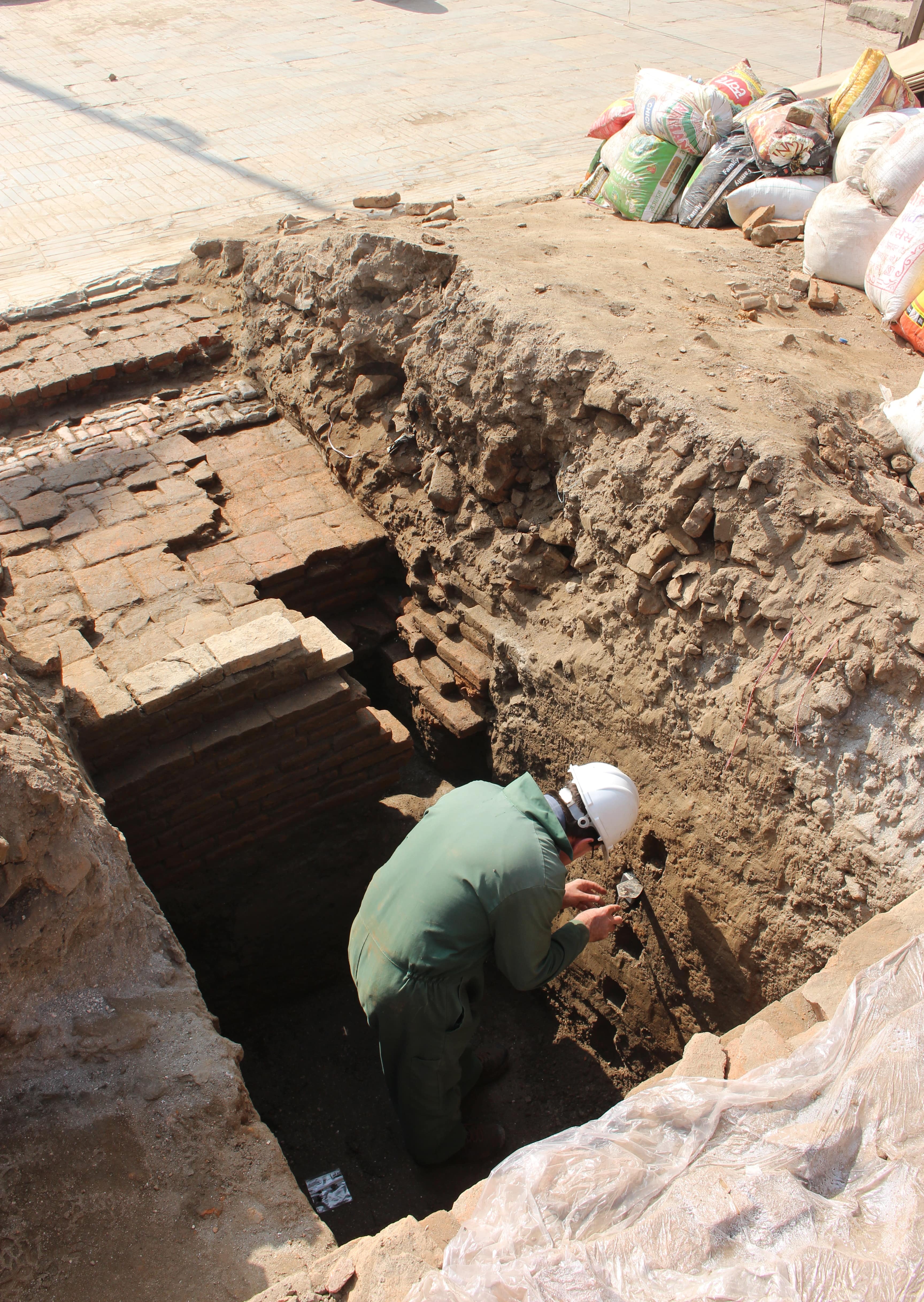 अभिलेखीकरण नगरी ईन्जिनियरद्वारा जग खनिएको दृश्य हनुमानढोका दरवार क्षेत्र (फोटोः दूरहाम विश्वविद्यालयका यूनेस्को सम्बन्धी अध्यक्ष)