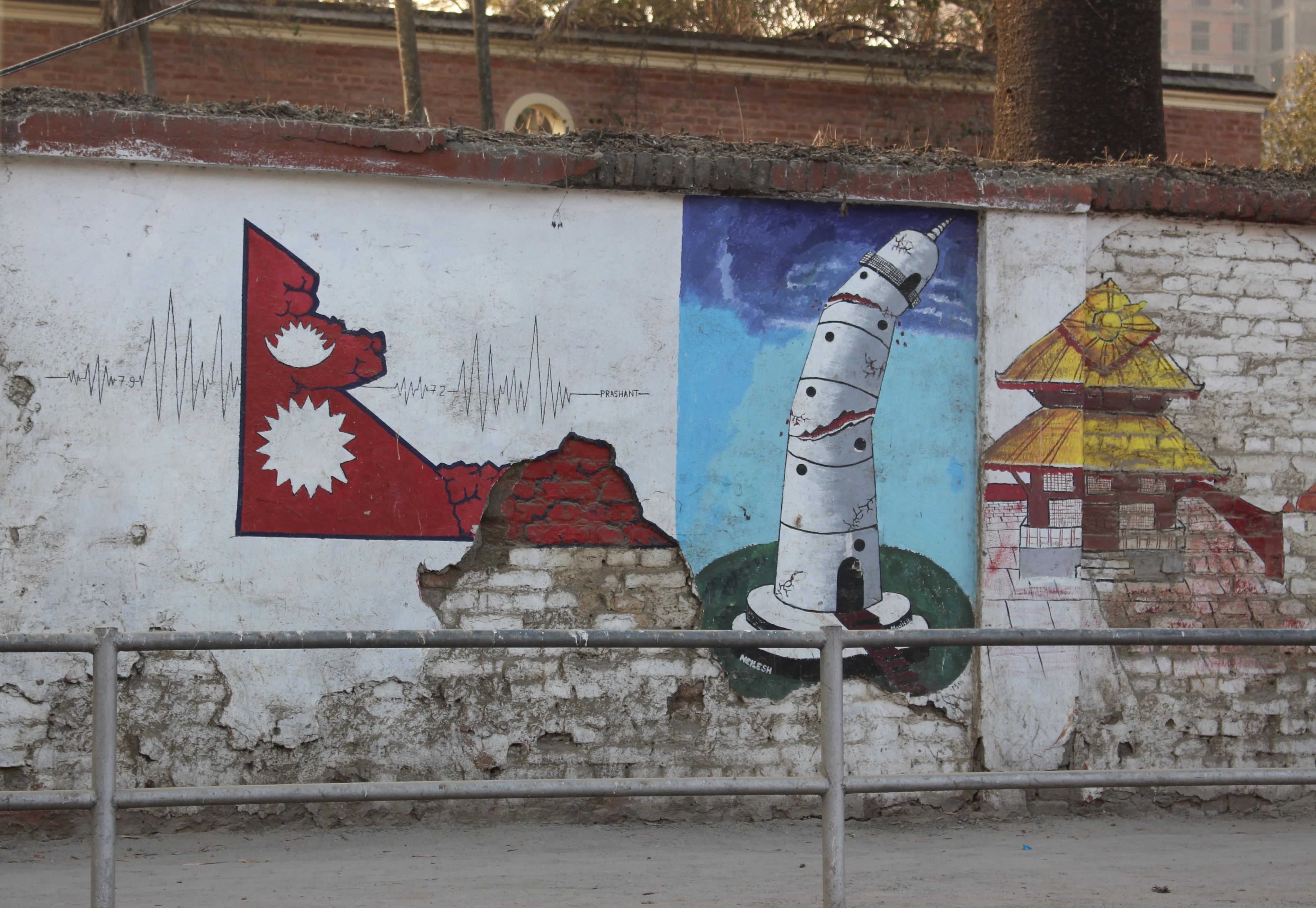 भूकम्पबाट ध्वस्त भिमसेन स्तम्भ र काष्ठमण्डप भित्ते चित्रमा (फोटोः दुरहाम यूनेस्को सम्बन्धी अध्यक्ष)