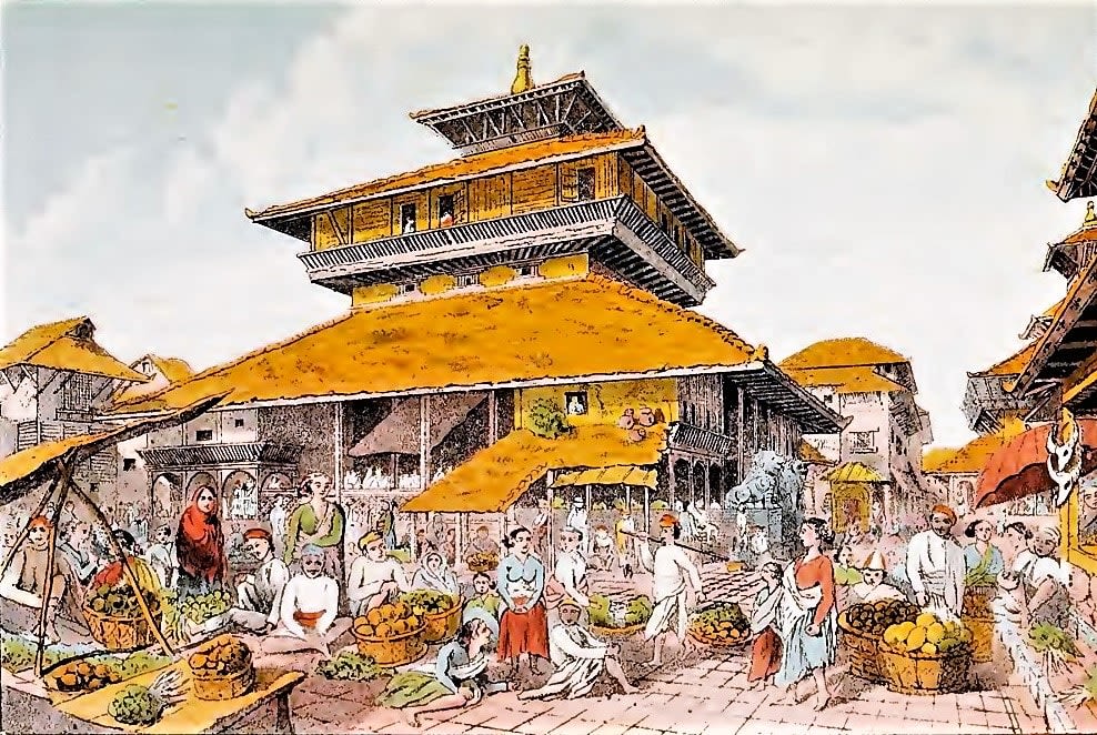 फोटो :काष्ठमण्डपको पानीचित्र हेनरी एम्वोर्स ओल्डपिmल्ड (सन् १८५०–१८६३ मा नेपालमा आवासीय दुत (फोटो साभार स्व. चाल्स एलेन)